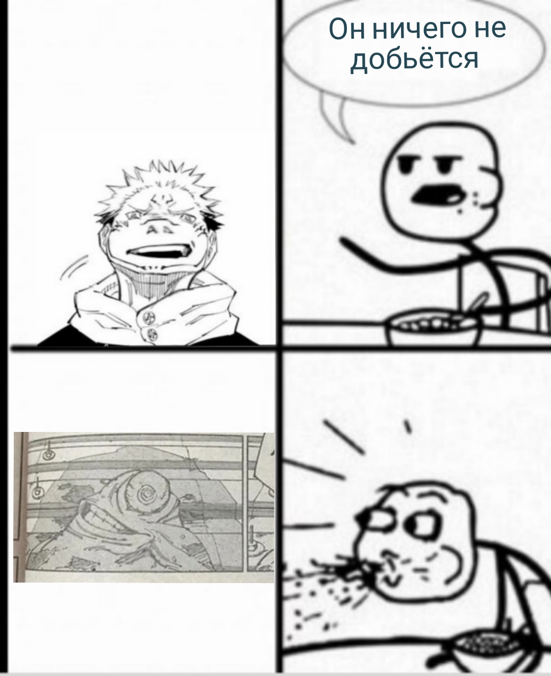 https://youtu.be/DCO2F5-Il18 Я со всеми этими мемами со сремой перестал воспринимать мангу всерьез. Но глядя этот часовой видос на 52:17, когда после десятков крутых фреймов из манги и серьезных обсуждений паверскейла автор вставил фрейм с Лужикуной я внезапно понял что это на полном серьёзе было в манге. Что злодей манги начался как пик 1, а закончился как пик 2. Пиздец я проиграл. Вот этот вот Сукуна ваш реально же стал лужой кала, лужицой кончи он стал. Вы вообще можете представить себе ебало Годжо, который говорил о том что хотел показать Сукуне все свою силу и научить его любви, если бы он увидел пик 2? Что бы он вообще подумал? "Бляяя я что неиронично пожертвовал своей жизнью ради такой хуйни, пиздец, какой же я дебил"? Охуеть какой абсурд, нет вы реально понимаете что пик 1 и 2 это один и тот же персонаж? Ахаахахах ахахах ахахахах