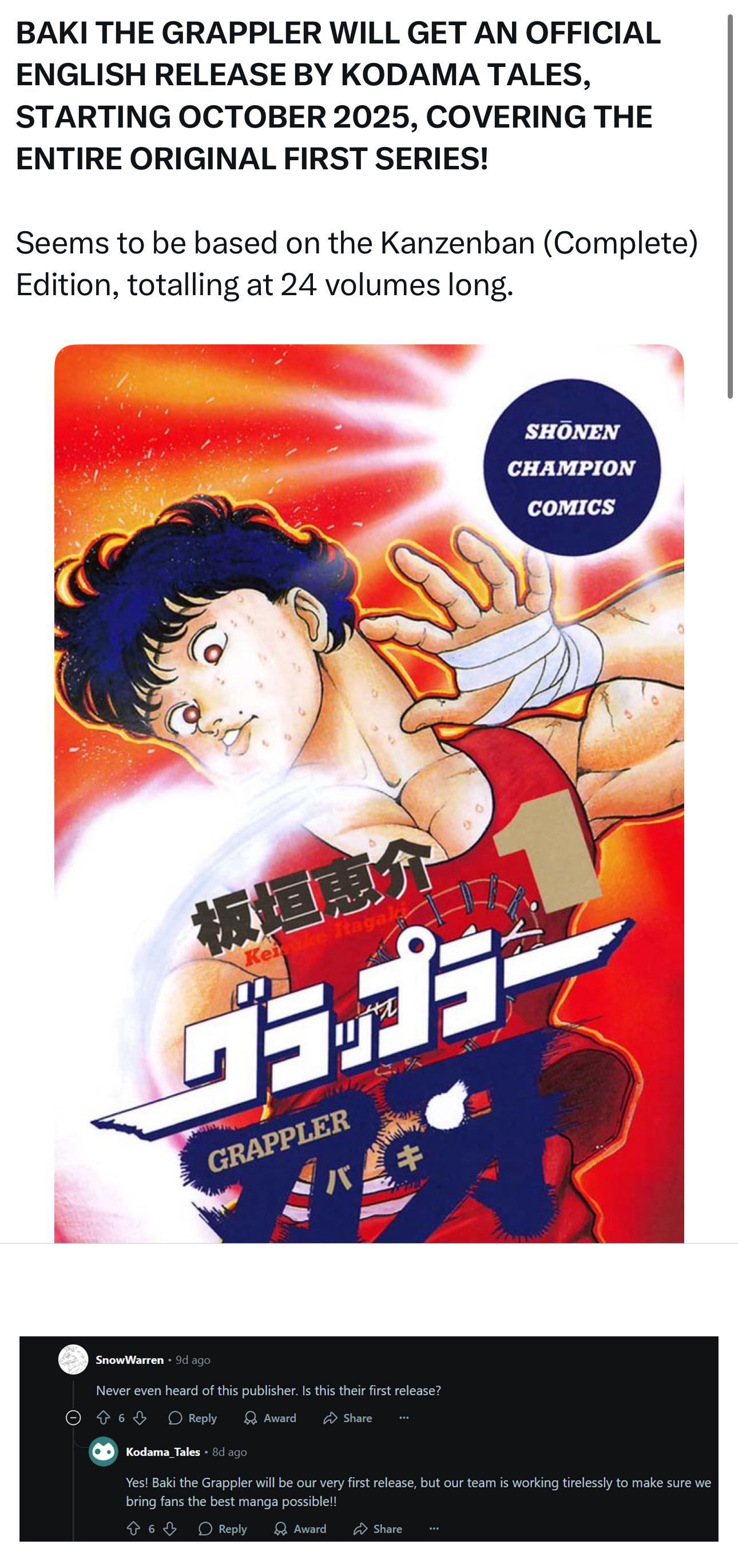 Может кому интересно будет. Kodansha выпустит на английском олдскульную мангу Ashita no Joe (Завтрашний Джо). В оригинальном издании манги было 20 томов. На английском Kodansha выпустит восемь объемных делюксовых книг в твердом переплете. Первая книга в декабре 2024 года. Средняя цена - 59,95$. Так же планируется выпуск в электронном формате.