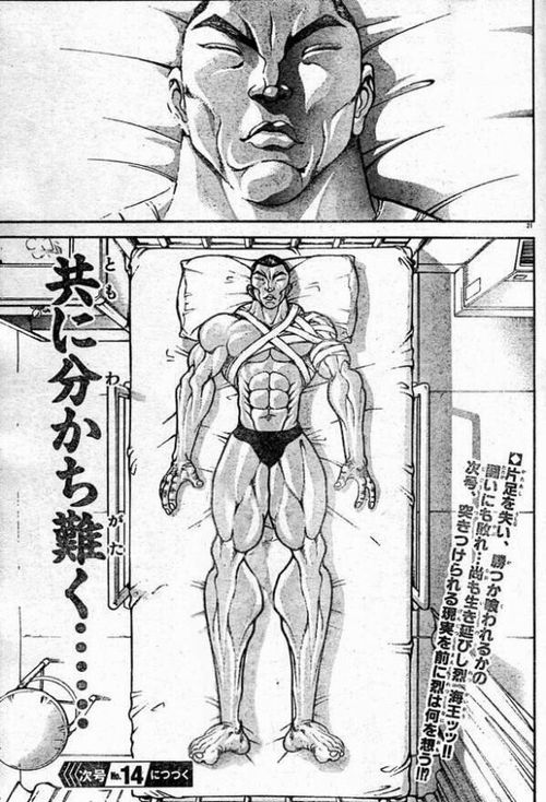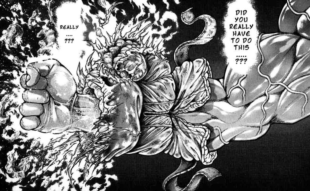Ну и микро-момент про уязвимые точки. >А за удары пальцами в волшебные места на пузе, от которых человек вырубается/ взрывается иди в Кулак Северной Звезды. Так то они и тут есть, когда Баки с обезьяной дрался, он бил мо подобным точкам, но это, правда, не сработало. А вообще оно понятно, что бьют и по яйцам и по глазам, но вот по швам черепа били пару раз, хотя силы у персонажей его разорвать вполне хватит, учитывая ебанутость этой манги хотелось бы видеть подобной экзотики побольше, ну или удары по солнечному сплетению, в которое по-моему вообще ни разу не ударили, но здесь я не ручаюсь. Вообще я имел в виду, что с безумной силой персонажей для них уязвимых точек в теле противника будет побольше, чем для обычного человека. Я уверен, что если один персонаж ударит кулаком по колену другого, то его ногу в обратную сторону вывернет. Но в целом ты прав и уязвимые точки тут существуют, просто у меня в голове были мысли про что-то более необычное.