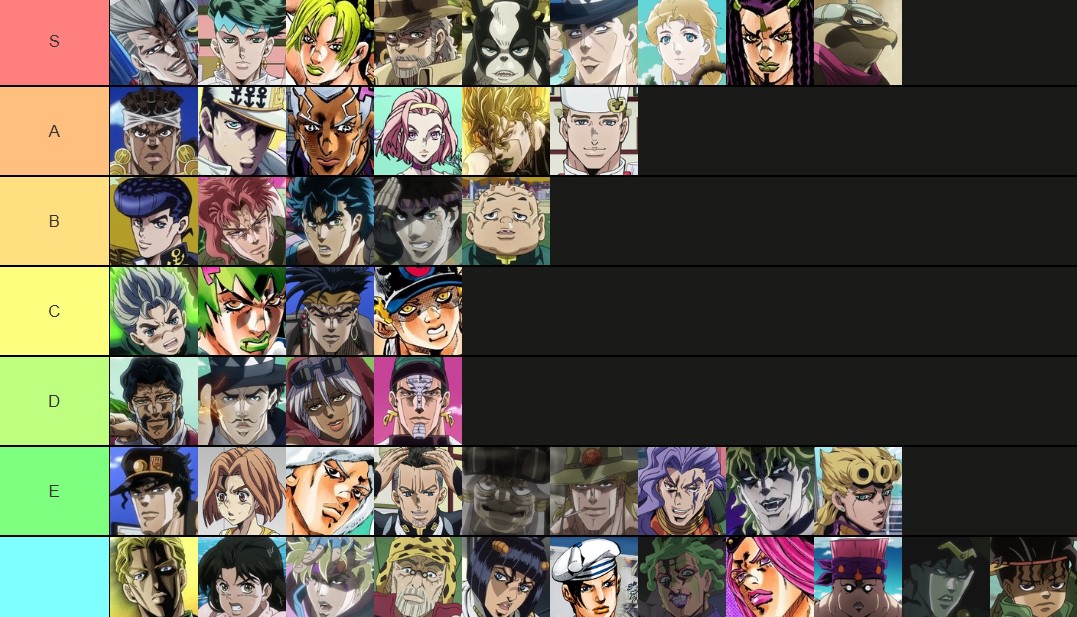 F Tier: 6 (вообще d, но f за любимый верс и Джотаро с его дочкой, а так... концовка пиздец, Эмпорио жалкая пародия на Хаято, путешествие героев хуйня, Пуччи кал, стенд юзеры вражки клоуны неинтересные и если честно я не помню что там происходило между комой Джотаро и концом истории)