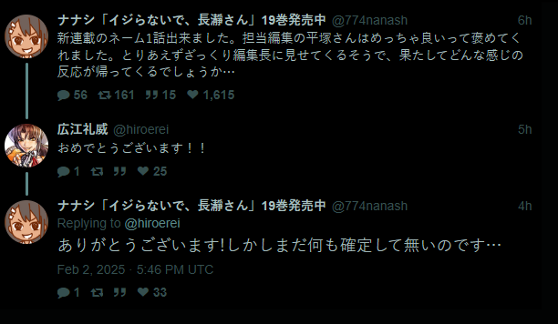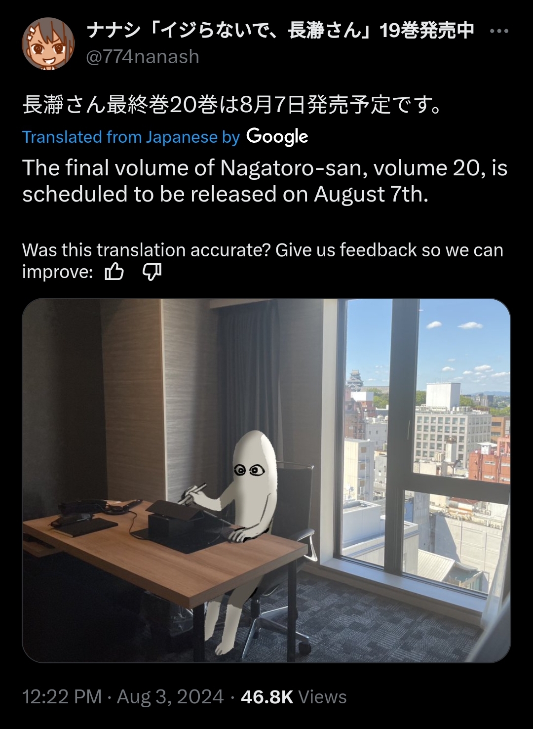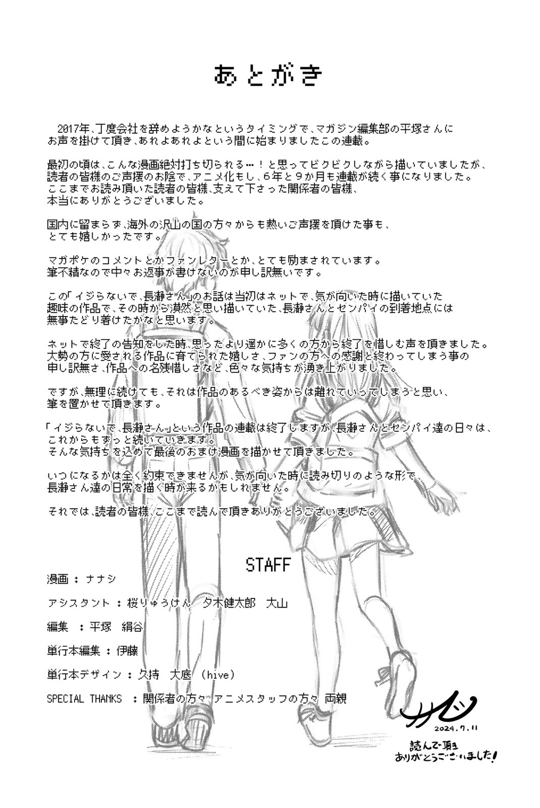 >>2351824 >>2351825 Afterword In 2017, just as I was thinking about quitting my job, Hiratsuka-san from the magazine editorial department approached me, and before I knew it, this series began. At first, I was nervous about drawing this manga, thinking it would definitely be canceled...! But thanks to the support of the readers, it was made into an anime, and the series has continued for six years and nine months. Thank you so much to all the readers who have read it up to this point, and to all the people involved who have supported me. I was also very happy to receive enthusiastic support not only from within Japan, but also from people in various countries overseas. I am very encouraged by the comments on Magapoke and the fan letters. I'm sorry that I'm not very good at writing, so I can't reply to everyone very often. The story of "Don't Toy With Me, Miss Nagatoro" was originally a hobby piece I drew whenever I felt like it online, and I think I've safely reached the destination I vaguely envisioned for Miss Nagatoro and her senior since then. When I announced the end of the series online, I received far more comments than I expected from people expressing their sadness at the end. Many emotions welled up inside me, including happiness that the series had grown into one that was loved by so many people, gratitude to the fans, regret that it was coming to an end, and a sense of nostalgia for the series. However, I believe that if I force myself to continue, it will move away from what the series should be, so I have decided to put my pen down. The serialization of "Don't Toy With Me, Miss Nagatoro" has ended, but the days of Miss Nagatoro and her senior will continue forever. With these feelings in mind, I drew this final bonus manga. I can't promise when it will be, but when I feel like it, I might draw the daily lives of Nagatoro and friends in a one-shot format. So, readers, thank you for reading this far. Manga: Nanashi