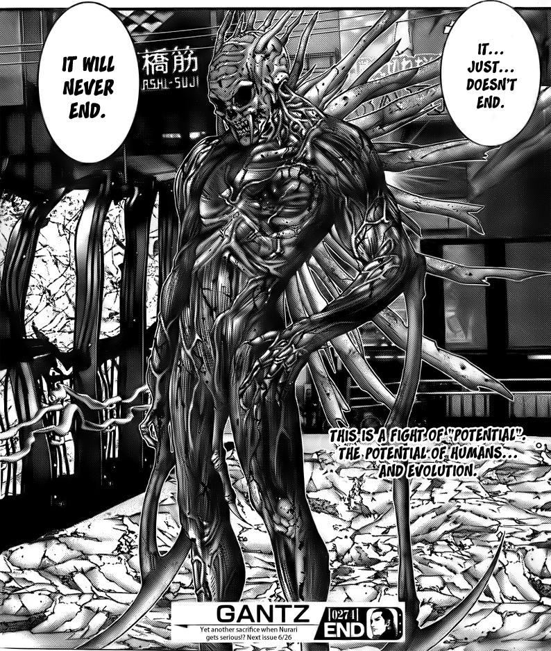Ганц охуенная манга почти до самого конца. Но автор в конце слишком перегнул с невероятными приключениями Таэ-чан у инопланетян и тему с двумя Куронами никак в финальном замесе не развил, для галочки потом выпилил одного с его сисястой подругой.