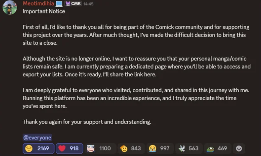 К 14.05.2025 , корейские пидорасы из Какао, подтянули своих братушек из соседних магазинов по продаже рулонов и побратимов из японских издательств, и скопом хуйнули dmca на Mangadex. 16.09.2025 всея одмин Comick заявил, что у него лапки и домены менять это не то и вообще извиняйте, хуй вам, а не манга. И пусть он хотя-бы списки открытыми оставил, сути это не меняет. Бывший модер на реддит вкинул, что корейские пидорасы и к нему постучали. Отсюда вопрос, что за хуйня-то? Мангалиб продал половину жопы комерсу, который вывел их в правовое поле, что привело к рейджу со стороны РКН и последующему выпилу кучи азиатских комиксов, реманга по схожему пути пошла. Охота на мнимое лгбт идёт по всем фронтамс выпила манги где шотландец в килте на одном фрейме стоял, я до сих пор охуеваю, мангалиб от страха охоту на ведьм устроил. Зарубежников продавцы рулонов душат. Куда идти то? Знаю, что слоупок, из отпуска вернулся новости по теме не смотрел и не читал и уход "комика" разогрел седалище...