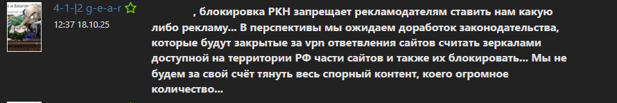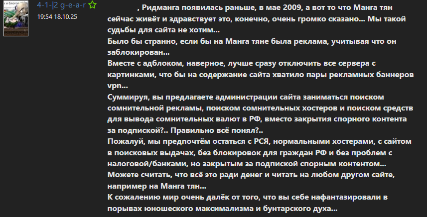 Один из пользователей даже спросил, "а почему просто нельзя забить на так называемые "письма счастья" от РКН, как делают это многие старейшие манга сайты? Да вы окажитесь в блоке, но зато ничего не нужно будет удалять" На что, он получил следующий ответ, пикрил прилагаю. То есть прочитав эти "влажные мечты" и так же слова про нам не хочется терять рекламодателей, становится всё сразу понятно, о чём думают администраторы сайта.