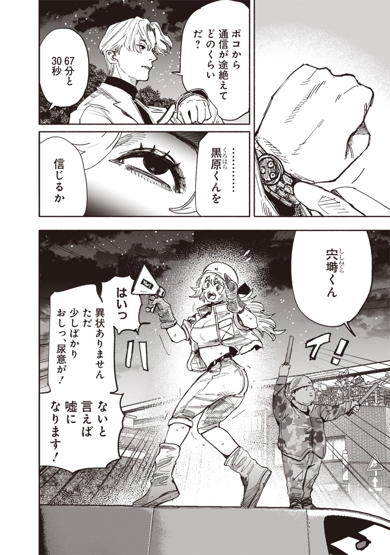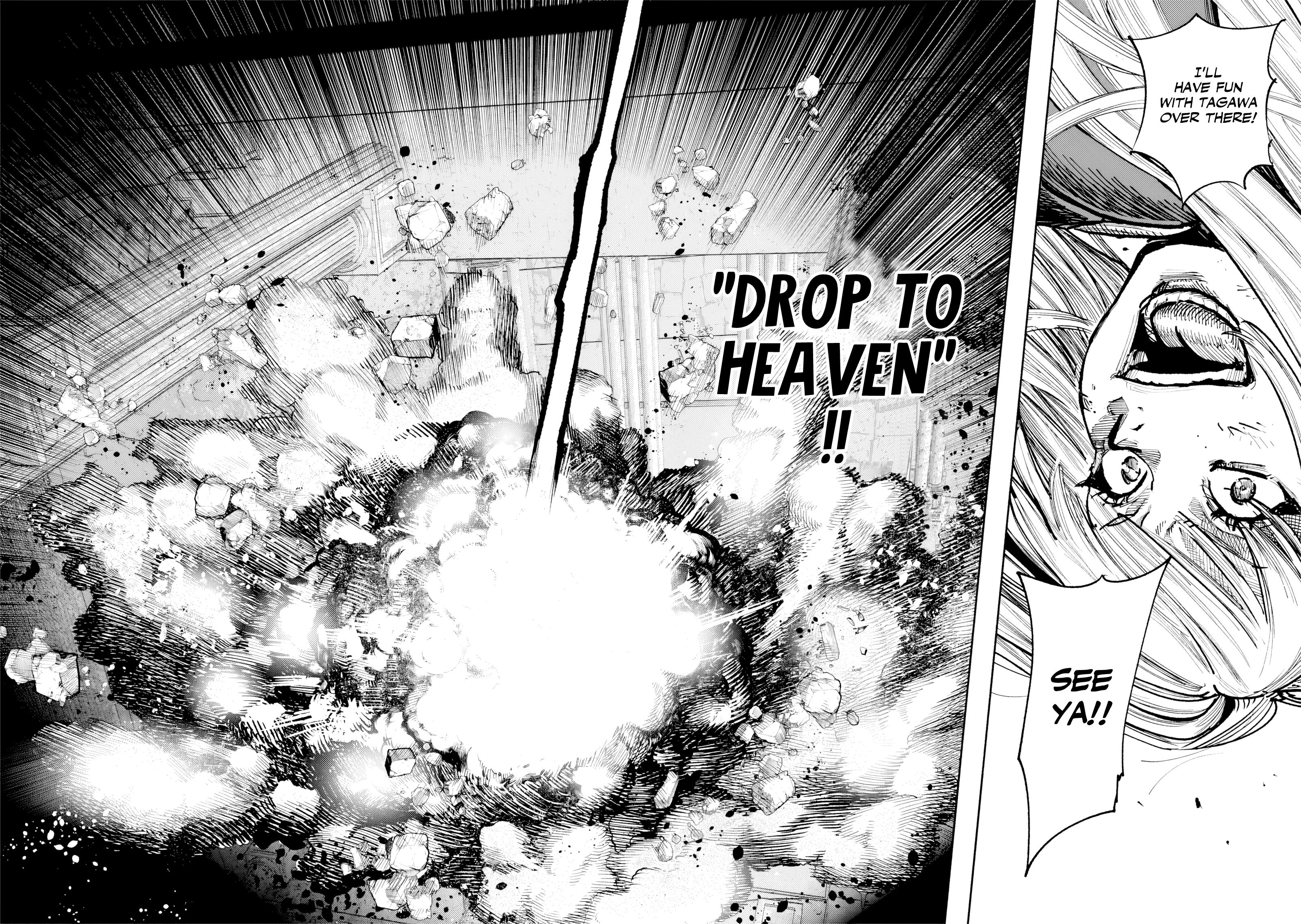 Сато начинает свой ход. Оставляет Пальму регулировать движение, но ей это явно не нравится, так что скоро она что-то выкинет. Еще ей очень хочется в туалет. С Токио они точно два сапога пара. Сандек пробует талк-но-дзютсю и получает по ебальнику так, что улетает кубарем через все измерения. Сора сохранила часть абилок и подсказывает Токио выигрышную формулу против Батисты (в глаза не смотреть и не попадать в его поле зрения, его абилка влияет на дух, от гравитации уклоняться) Токио разгоняется и отрезает таки Батисте руку Соры. Очень юморная глава в типично ишидовском стиле. Только он может сделать драку против босса каким-то prison school лол.
