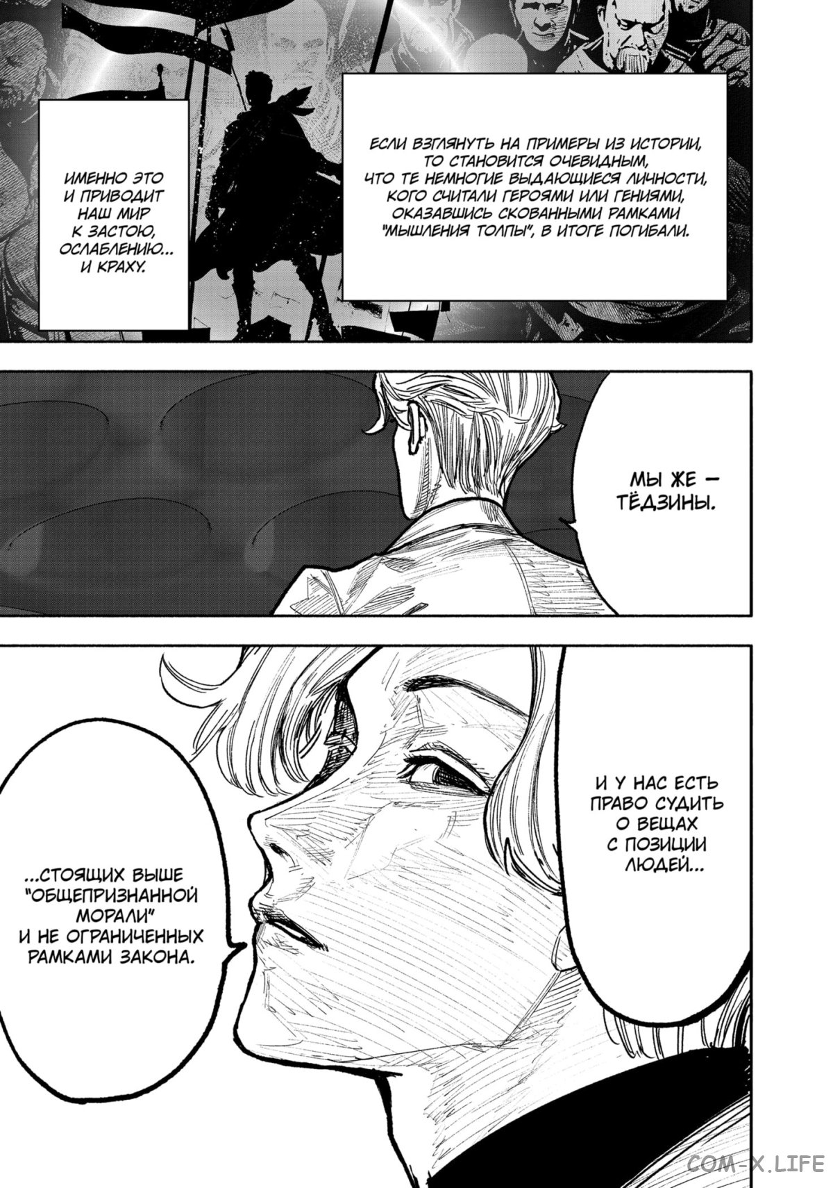 ПИЗДЕЦ продолжается. Батиста соединил свою абилку управлять гравитацией и способность Нох "соединять" воедино концепты, что дало ему возможность разрезать пространство-время и сформировать закрытый манямирок, в котором его по всей видимости будет ждать живая Хартли, так что в следующих главах наконец-то пояснят, что между братьями случилось в прошлом. Очень похоже на концовку Dark City, который Токио смотрел в одном из эпизодов. Вот только сила Х это обезьянья лапа, так что Батиста наверняка поймет, что его мечта неосуществима.