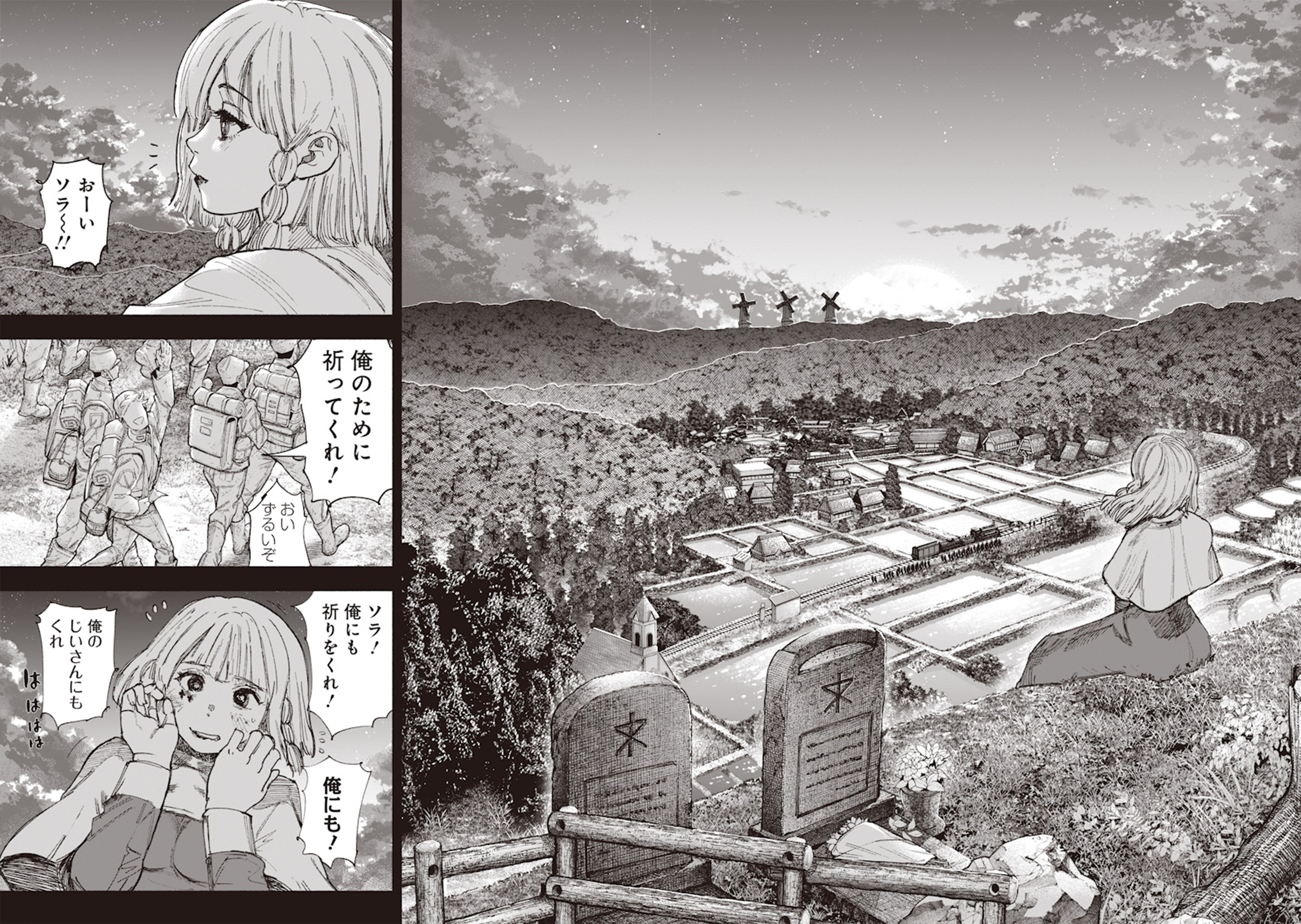 >Батиста передает Знак Эли >она делает такое вот веселое лицо перед тем, как ее вырубает >Сора перед смертью снова вспоминает прошлое, солдатиков идущих на войну, своих "детей" из башни, и, по всей видимости, мирно умирает >и тут по Ямато прилетают ракеты, либо Гуэлта решила отомстить, либо кто-то из союзников неподалеку предал