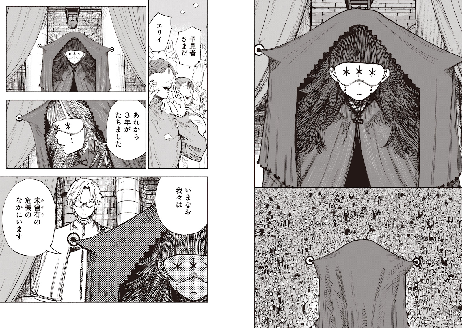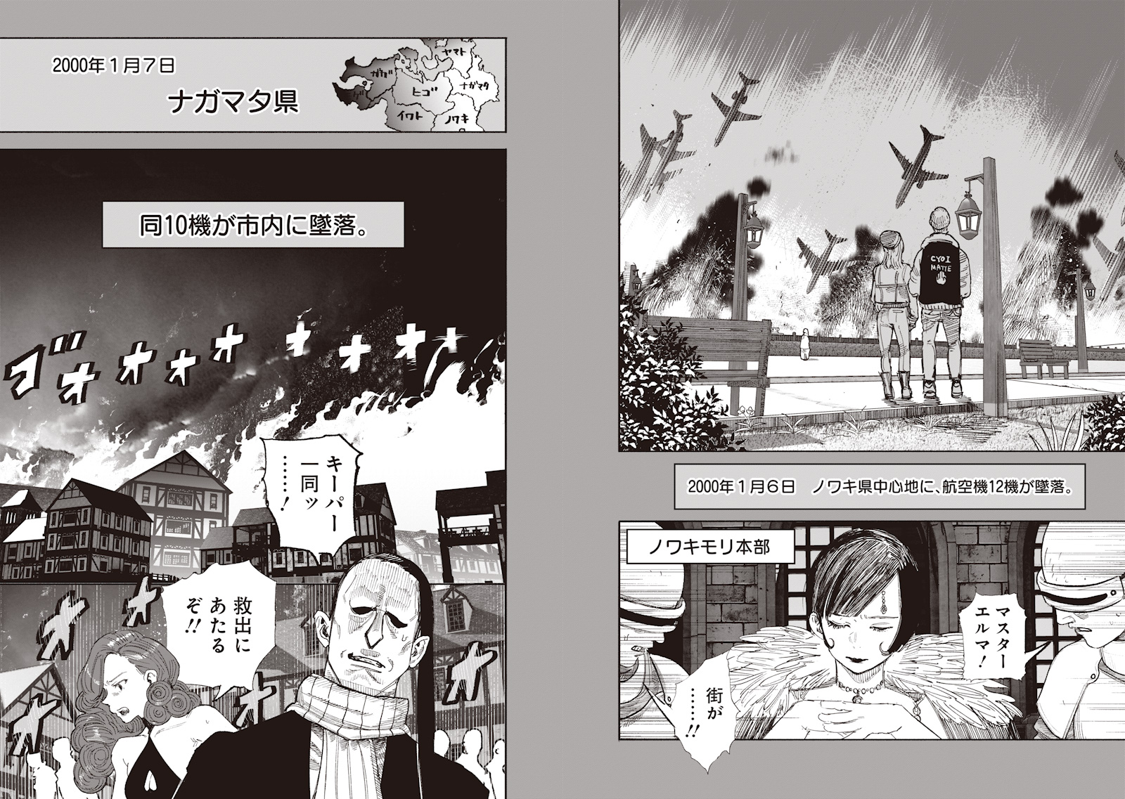 Ой бляяяя. 3 года спустя. Какой-то новый персонаж (это НЕ сестра Токио) везет в урне прах с надписью "Дядя" на поезде. Сверхпродвинутые летательные аппараты бомбят людей. Прибывает "Пророчица Эли" и обращается к толпе, говоря, что они переживают небывалый кризис. За ее спиной стоит разодетый как принц Азума, который вспоминает прошлое. 3 года назад Артур использует свои силы на деталях самолета. Его абилка позволяет превращать в песок практически что угодно, кроме живых вещей, поэтому его силы не работают на предметах, произведенных тёдзинами. Он не может превратить в песок некоторые детали самолетов, что означает злой умысел тёдзинов за атакой. Эли начинает получать видения, как Мадо. Она выглядит ментально сломанной, грубо разговаривает с Пальмой и рисует видения новых атак самолетов, которые происходят с другими странами сеттинга буквально через пару дней. А потом появляются гуэлтианцы на танках под предводительством пожилой леди, которая выглядит как очевидный клон Куима.