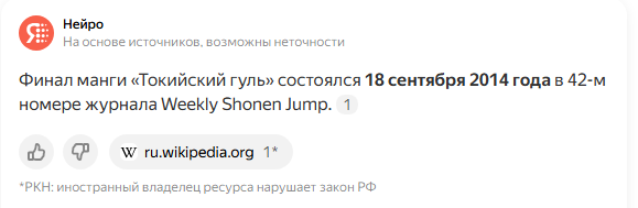 И у меня до сих пор подгорает, что токийский гуль завершился не ядерным экстерминатусом дракона канеки, а вот этим вот всем. Когда я его читал, там всё шло к ядерке как самому логичному завершению, но потом автор зачем-то соскочил с этой темы. Какое нафиг объединение CCG с гулями, какая нафиг победа над драконом, почему почти все главные герои выжили, почему канеки за свою выходки ничего не сделали? Почему автор вместо сгорающего в термоядерном огне дракона канеки сделал вот это вот всё?
