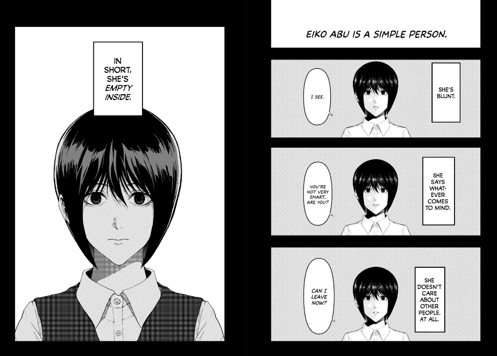 Признаться честно, я и сам нихуя не читаю, ну вот Abu (лол) пробовал читать, это что из нового. Такая хуета я ебу алибабу просто. Чето баба без эмоций опустила инсела, он за это её отпиздил и чуть не зарезал, но она уже сама хотела его зарезать, а потом женилась на нём, когда он ей перед смертью свой манифест излил о том как бабы не дают. О чем манга, я хз, вроде как о том, как тяжело жить телке с аутизмом которая нихуя социальных норм не понимает и ест рыбу из аквариума, но на самом деле о каком то инселошизе которому бабы в джинсы говна залили. Дроп в конце третьей главы.
