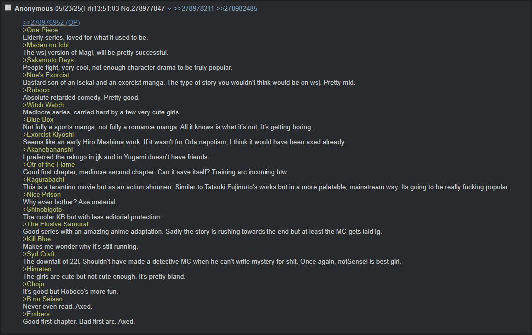 Химатен болтается на дне рейтинга, но автор вводит новую героиню в гарем. Оптимистично настроен, видать. Киллблю, похоже, сворачивается. Экзорцист даже хз. То ли это пизделка сфиналбоссом, то ли это местный арлонг.