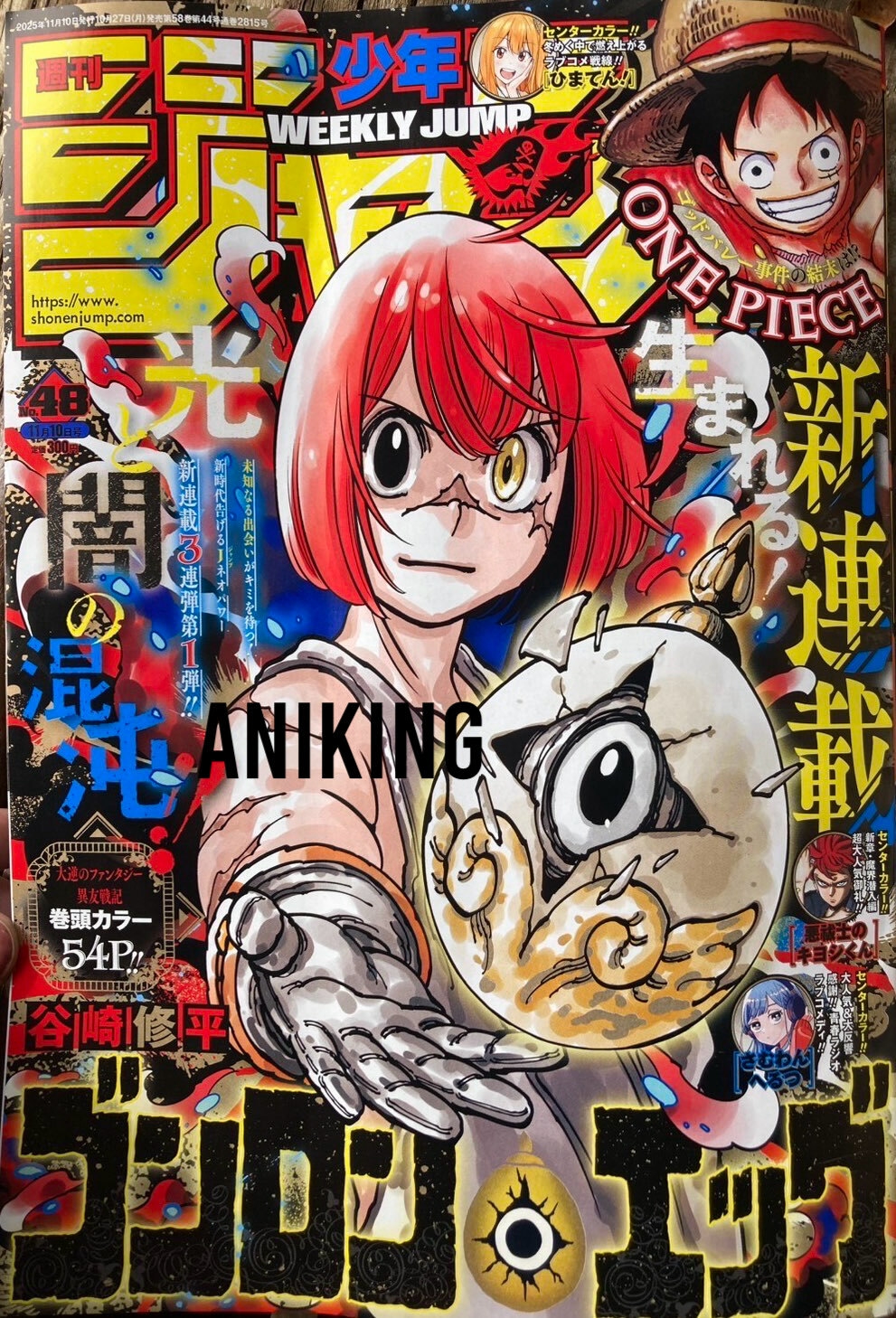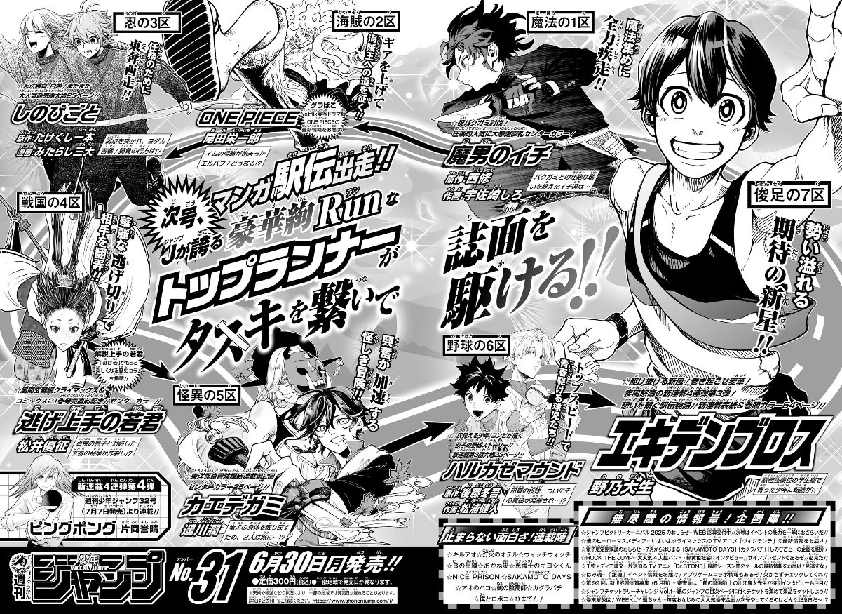 Weekly Shonen Jump Issue #31 (2025) Ekiden Bros (Cover & Lead Color Pages; 54p; New Series by Nono Daiki) Kagurabachi ONE PIECE Blue Box Me & Roboco Kaedegami (Color Page; Second Chapter) WITCH WATCH SAKAMOTO DAYS Ichi the Witch (Color Page) Harukaze Mound Otr of the Flame (First Ranking) Ultimate Exorcist Kiyoshi Akane-banashi Shinobi Undercover The Elusive Samurai (Color Page) Nue's Exorcist NICE PRISON Hima-Ten! Kill Blue Star of Beethoven (End of Serialization)