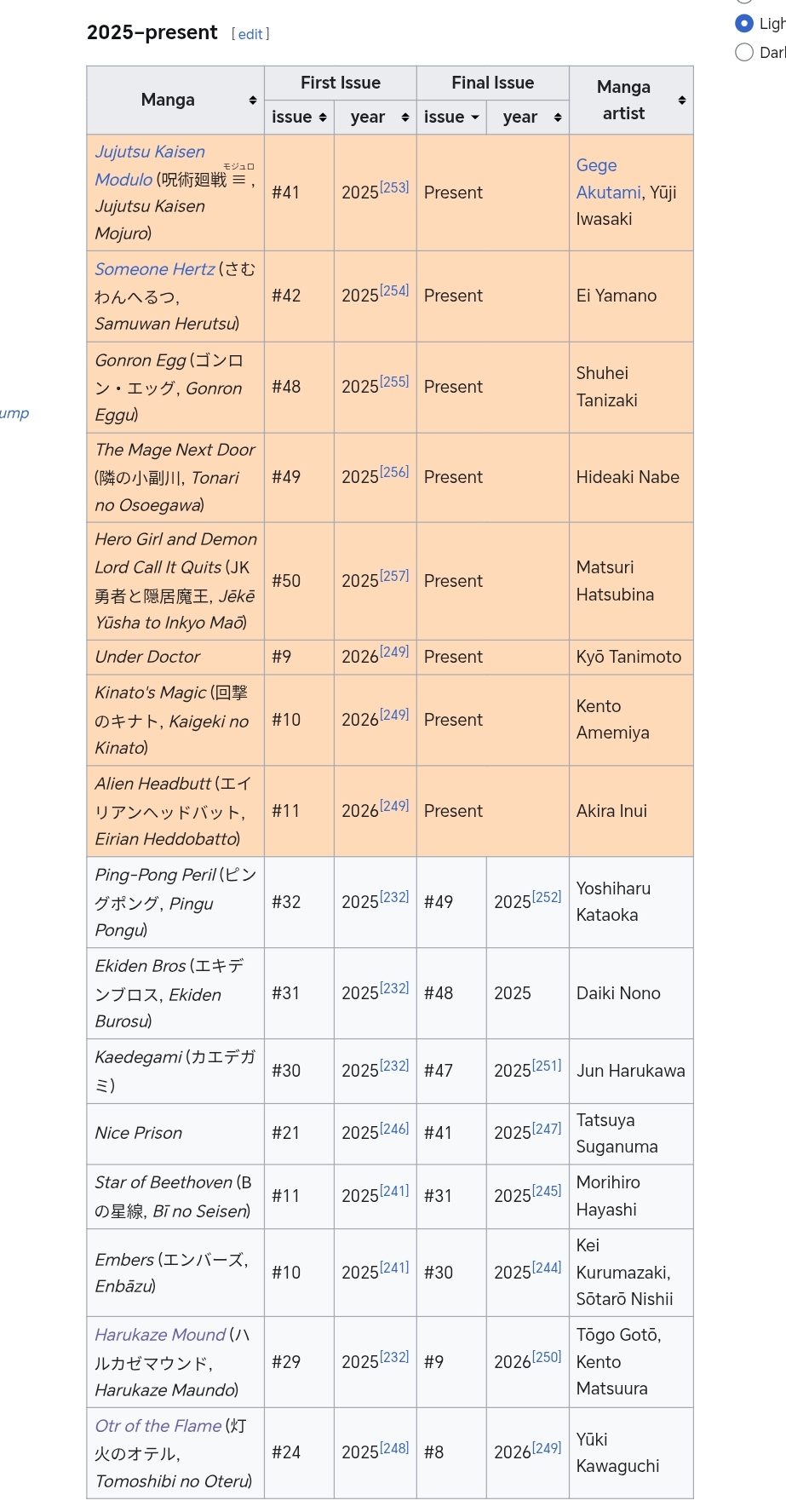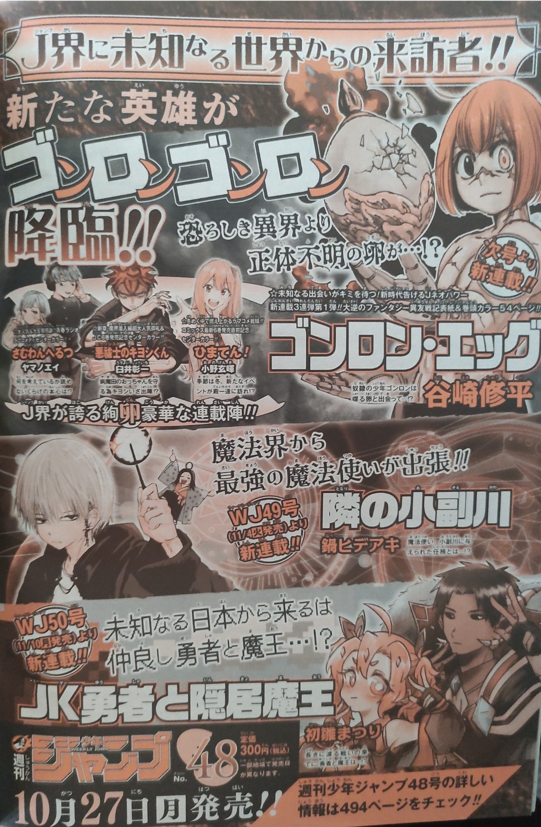 >Issue #48: 'Gonron Egg' by Tanizaki Shuhei (Ware wa Ryujin). >Issue #49: 'Tonari no Osoegawa' by Hideaki Nabe. >Issue #50: 'JK Yuusha to Inkyo Maou' by Hatsubina Matsuri.