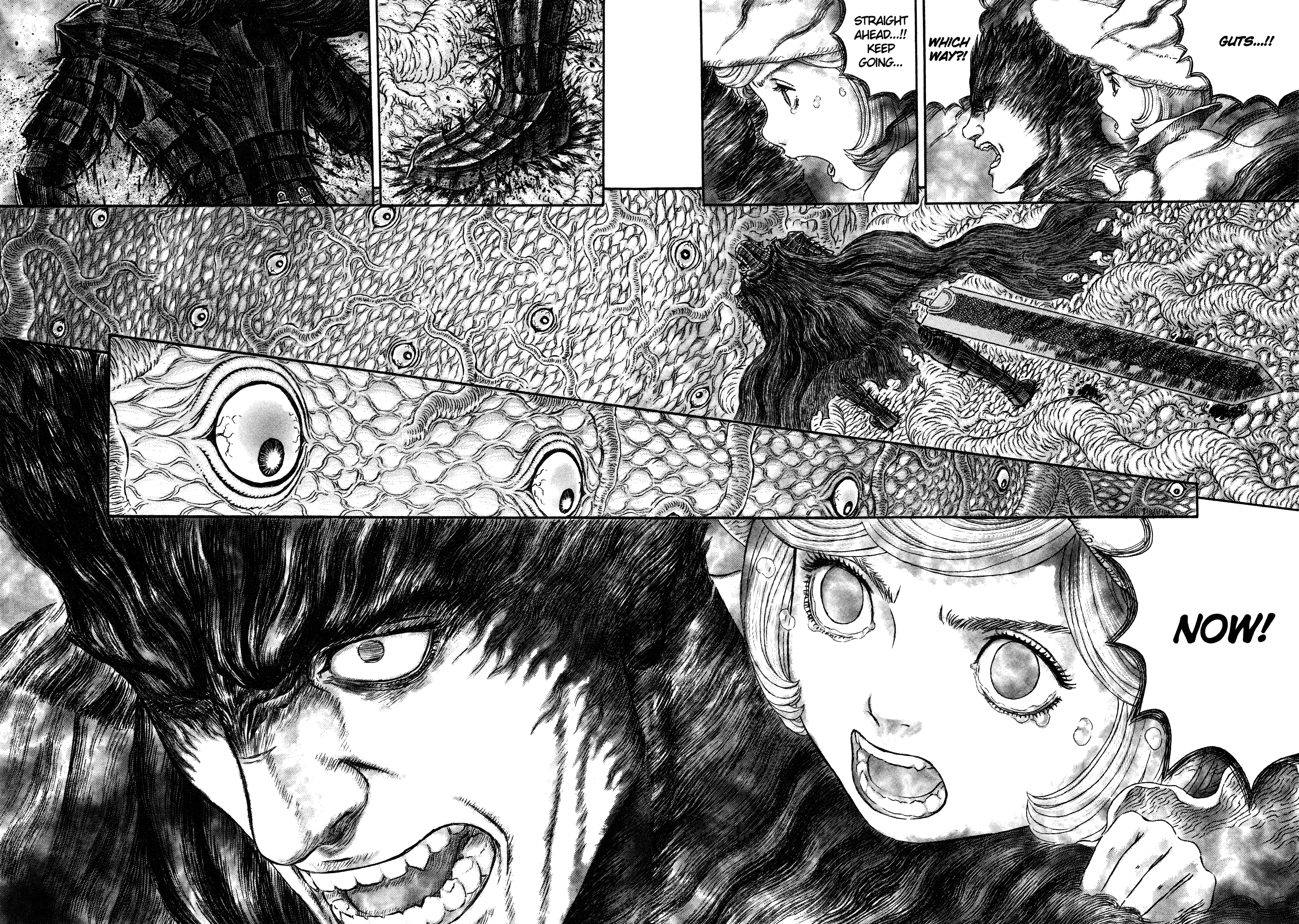 Тем временем, Гатс всю мангу думает и переживает о Каске, мысли о Каске помогают ему восстановить свое эго когда оно посыпалось под воздействием доспеха, несколько раз задается вопросом что же он будет делать когда Каска вылечится и когда его путешествие закончится. Почему Гатс фулл игнорит Каску, а думает о мече о котором никогда не думал - необъяснимый бред Мори, срущего на гроб Миуры. Гатс наоборот должен воспылать новой злобой и силой от того факта что его сознательное желание теперь совпадает с его бессознательным желанием - и сам Гатс и его Зверь теперь в гармонии, так как оба желания ведут к Гриффиту.