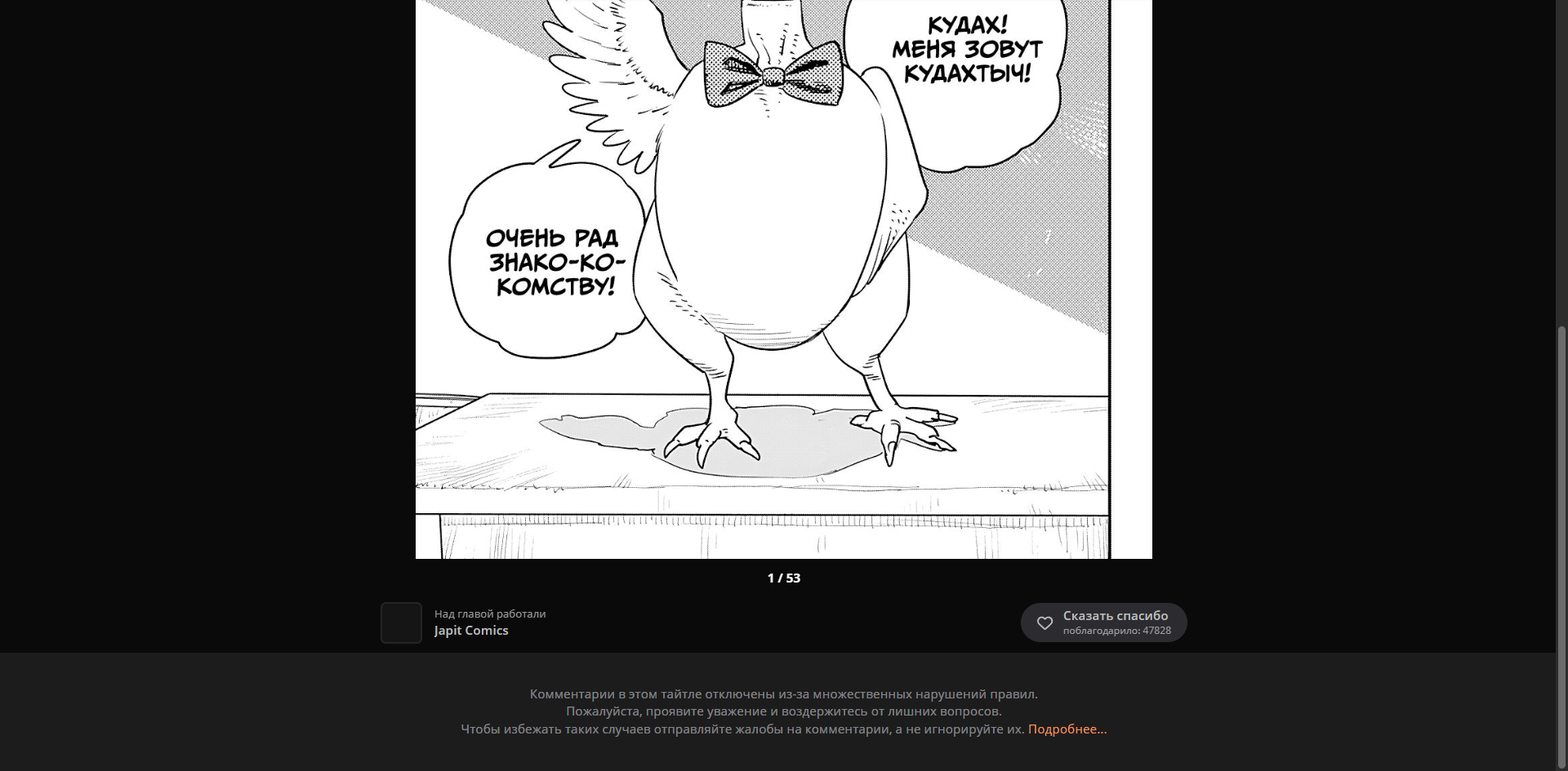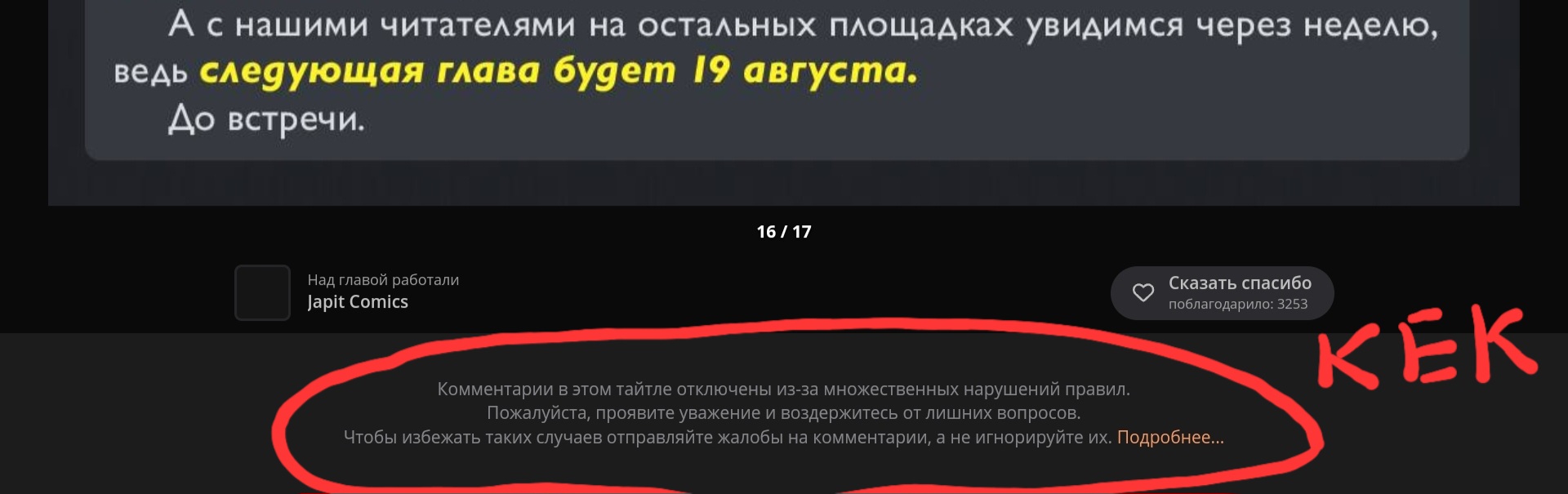 И остался третий пункт, который уж да, за непониманием движухи все крупные паблики дропнули из новостей, но он остался. Давайте поясним прям на пальцах. Есть условные мы, Жапит Комикс. Мы делаем условного Бензочелика. Делаем регулярно, справно и качественно. Претензий особо нет. И тут влетают ребята, которым администрация помогает в обход правил занять альтернативную ветку перевода. Что тоже есть в новых правилах, мы кидали скрины. Это буквально легальный обход закона для своих. Так вот, эти ребята не хотят просто делать пилу, что ещё можно было бы списать на тупой фаворитизм и затерпеть. Нет, они хотят делать платный перевод. Опять же, чёрт с ними. Их право. Но из-за новых правил теперь уже мы не можем релизить свои главы, пока их главы не выйдут из платного доступа. Вы себе такое представить можете? То есть выходит условная глава номер триста пять во вторник. Мы делаем её во вторник, и они делают, кидая под платку, которая будет держаться условную неделю. И вот всю неделю мы будем вынуждены держать главу в загашнике, потому что это нарушение правил. А карать за них обещают жёстко. Два нарушения, и команда отлетает в Вальгаллу покоиться навеки. Да, это может случиться не с пилой. И вообще не с нами. Но лично я не держусь принципа, что если проблема чудом обошла тебя стороной, то её теперь не существует. В целом-то мы уверены, что это будет в 99% случаев касаться хайповой манхвы, на которую нам плевать. Но где нечестный удар приходится по одним, он всегда может прилететь по другим.