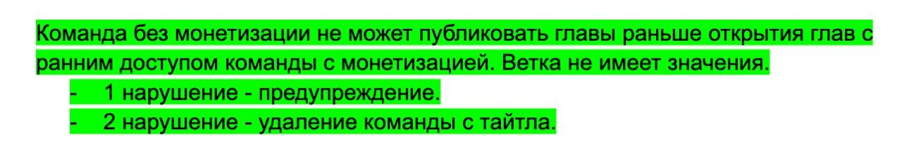 Второе — это прекрасное правило для альт переводов, которое можно назвать просто: "монетка или смерть". Суть такова: если на тайтле имеются альтернативные переводы, один из которых платный, второму (даже если он основной) НЕЛЬЗЯ РЕЛИЗИТЬ главы до релиза платного. На первую ошибку предупреждение, на вторую расстрел. А самым смешным здесь выглядит подпунктик, что администрация может без соблюдения правил, ограничений и других клёвых штук, которые ставили всех в равное положение, натурально добавлять альты по собственному желанию. И у переводчика остаётся два варианта: ливать с позором либо самому врубать себе монетку и тоже выкладываться в раннем доступе.