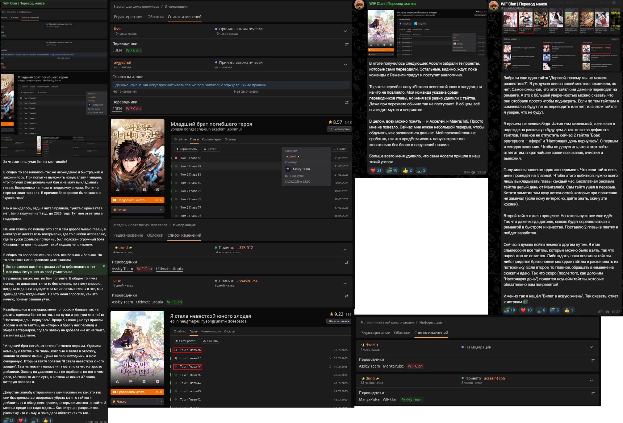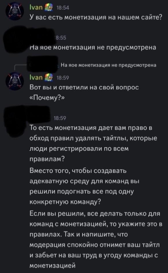Вот довольно неплохой тому пример, который мне рассказали уже после того, как была написана первая паста. Объявился не так давно в стане Мангалиба администратор ikvst, а в дискорде и на скринах — Иван. Стал Иквасик под предлогом бета-тестов сайта и прочих неурядиц протискивать супротив правил команду Assley Team на различные тайтлы в обход правил. Кто такие Ассли тим? Как раз-таки ребята с Реманги, рубящие деньжата на платных переводах. Вот таким дают альт-ветки, подкидывают им право на новые произведения. Опять же, всё в обход правил. На слова уровня "а что как" в целом шлёт всех куда подальше и активно намекает, что пока ты не являешься ОФИЦИАЛЬНЫМ ПАРТНЁРОМ Мангалиба, то ты даже не тварь дрожащая, ты — плесень трясущаяся.