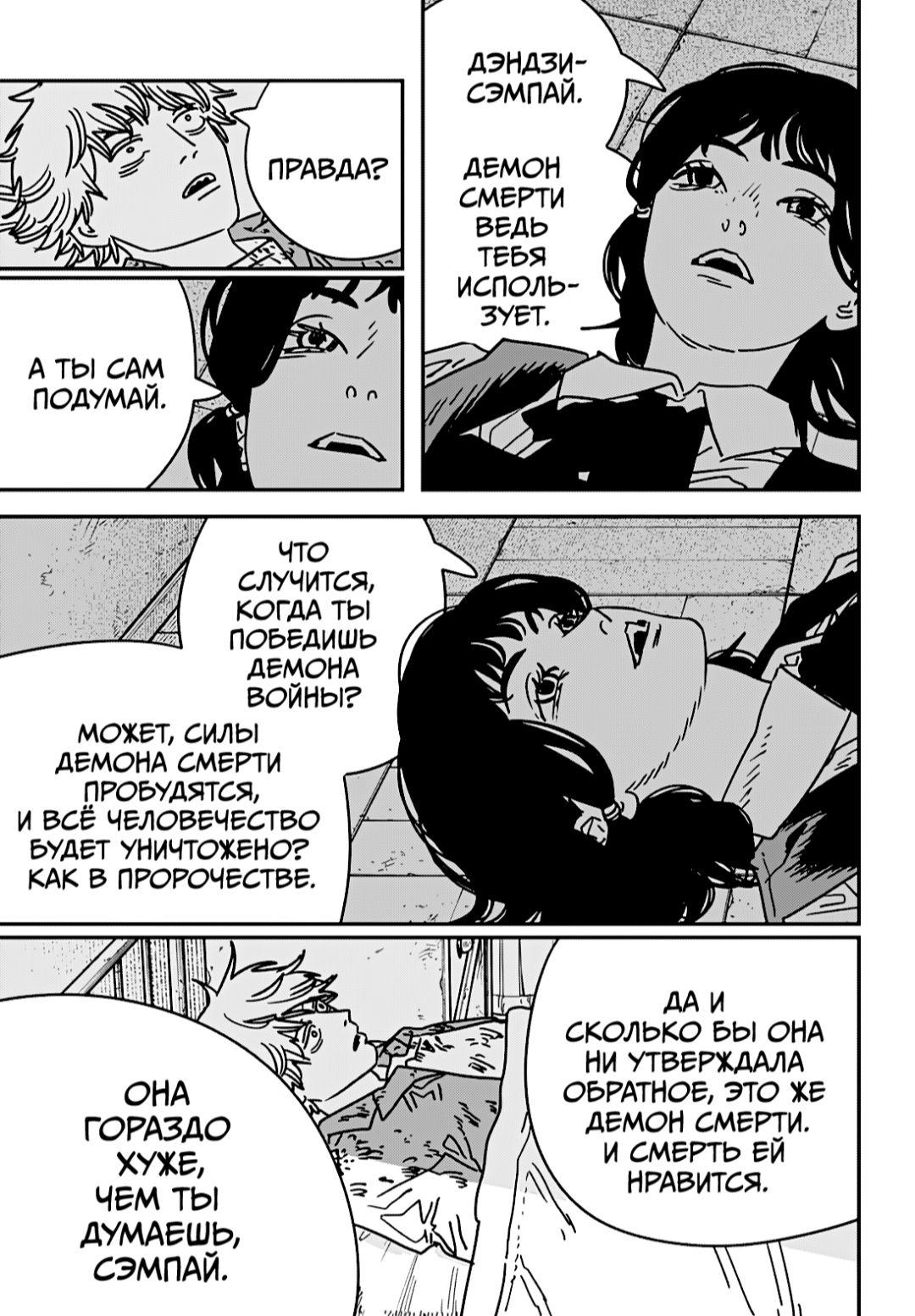 >>2445686 Неиронично это так Он всë знает про демона Смерти с самого начала манги и мешает ей в меру своих сил В конце своего сна Аса видит "тьму", а конкретно что-то очень нехорошее для неë За этим будет стоять демон Смерти Очевидно история Асы и Денджи,а так же их взаимоотношения являются эндгеймом второй части и следовательно в том самом переулке аналог двери из первой части она не умрëт, а значит вмешается Йошида и поможет ей выбраться из этой глубокой жопы Не просто так он стоит на фоне переулка обложки 17 тома Судя по ласт главам у нас есть Макима 2.0 в лице Смерти, которая уже сама "не знает" чего хочет На деле же у неë имеются свой скрытый мотив и план на Асу Митаку, как у Макимы на Денджи Она умело манипулирует окружающими персонажами ради достижения своих целей, но как и в реальной жизни - всегда найдется рыбка покрупнее Правда варианты с бессмертным человечеством или вечной войной выглядят как полная хуйня Вероятно Денджи в своих лучших традициях найдет 3 путь и порешает всë на долгожданный хэппи энд