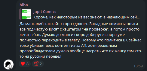 С новым адпейтом они хотят запретить выкладывать ссылки на бустачи, вк, телеги, дискорды, стены подъезда — да любой сторонний сайт. То есть, мало того, что нам, как сканлейтерам, рубят способы материальной поддержки, ещё и идёт активное противодействие созданию наших комьюнити, как вот вы, например. И это довольно омерзительная вещь на самом деле.