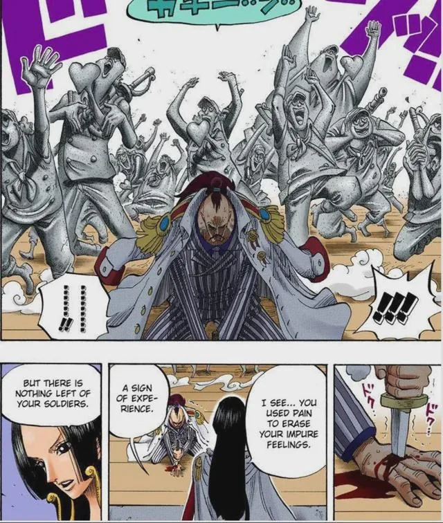 >>2444461 Контекст совершенно разный у сцен. Момонге пришлось ножом себе руку поранить, чтобы заглушить естественные чувства, что у него точно возникли бы при виде самой красивой женщины. Он это сделал по двум причинам. Он на задании + он в курсе опасности ее фрукта.