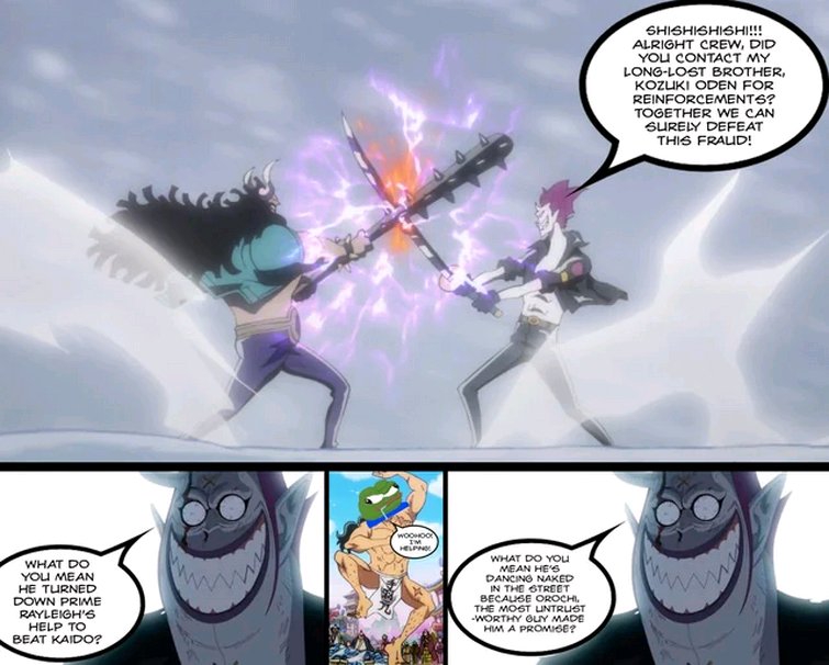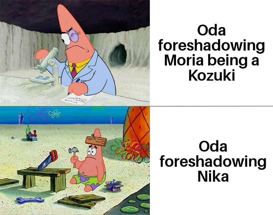 Если Мория действительно из Вано и сражался с Кайдо чтобы защитить страну, то вопрос - а нахуй вообще нужен Оден в сюжете? Вот этих всех несостыковок, что ни Белоус, ни Роджер не помогли своему братишке защитить родину просто не существовало бы, если Одена не было. Было бы так: Кайдо залупнулся на Вано, его попытался остановить Мория, но опиздюлился, потерял команду, сбежал и на Триллер Барке начал готовить армию из бывших членов команды Рокса и прочих известных личностей чтобы отомстить. Всё ахуенно же складывается. Но откуда-то то высрался Оден. Такое ощущение, что твист с Морией это что-то из оригинальной задумки Оды, возможно что-то что было запланировано еще в Триллер Барке, но потом пошло по пизде.