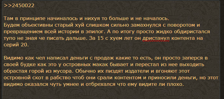 >>2451444 >Большинство шоненов ни во что не может. Они про дружбу и драчки и с этим справляются. Тащемта это правильные посылы для детей были, жаль они их не поняли и выросли соевиками. >И очевидно там главные герои дохли, кайто и нетеро к примеру. В каком месте они главные? Кайто не помер это раз. Во-вторых Нетеро это сильнейший дид а такие погибают. Ямамото, Белоус, Джирая и множество других. >>2451445 >А про остров жадности что думаешь? Как по мне пиздато в волейбол сыграли. Считаю, что не дожал. Идея с картами хороша, видать Югио Тогаши недавно играл когда арку делал но как-то по верхам получилось. Ощущения как и от Небесной башни где вместо мастеров боевых искусств показали калек и пару дебилов не считая Хисоки. >Взять хотя бы марионетки разора, их можно было заменить преступниками, хз чего он протупил. Нахуя эти юзлес марионетки, с виду рейзор вообще ебанутый усилитель типичный перекаченный долбоеб. Каким хером он манипулятор выделятор? Рейзор это отсылка на Сенсуя из прошлой манги. Тот тоже имел команду подручных но оказалось что он сам себе армия из шизофреника с 7 личностями а подсосы ему не нужны. Ну и да, тоже абилка странная спрашивается зачем ему марионетки если он просто энергией или мячом как ядром стреляет.