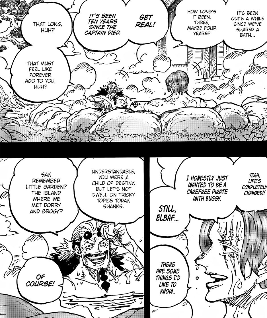 Бля ну и нытики. Ну показал Ода легенд мира Роджера и Белоуса более человечными, что плохого? В главе так-то много плюсов. Акаину раскрывают, Шаки и Рейли, Гарп неоднозначный персонаж как и любят современная аудитория
