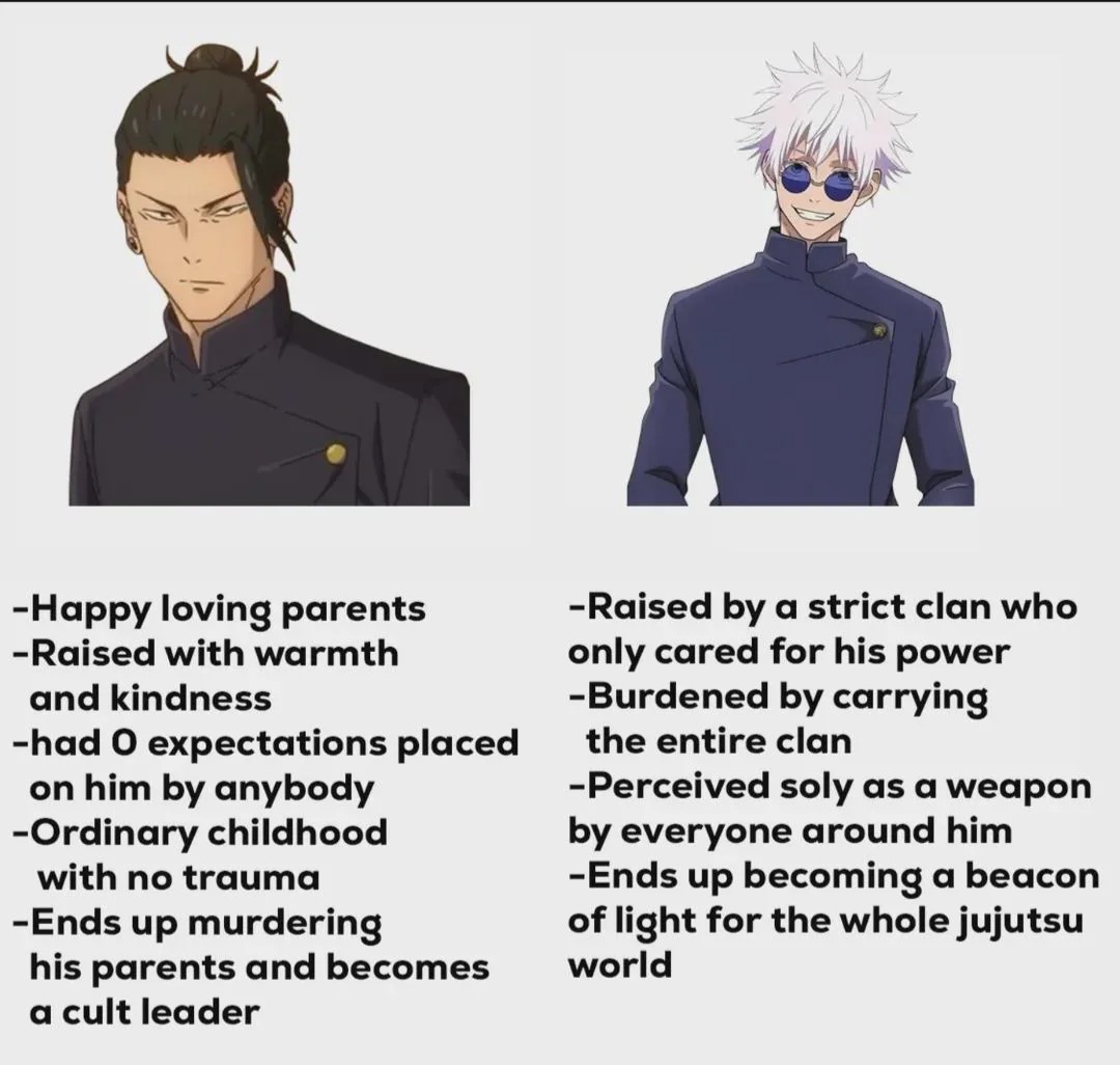 >>2455274 Потому что если их поменять местами, то Юта слишком эффективно пугал бы бомжей в переулках Рикой даже не доставая катану из штанов. А Юджи проебал бы клан Годжо и не соединил его кровно с одной из последних из клана Зенин. Он бы вообще в жены Озаву взял и наплодил дажа не бастардов, а хуже и все это под именем клана. Величие и богатства рода Мичизане сгинуло бы в коммуналку 5 на 5 метров.