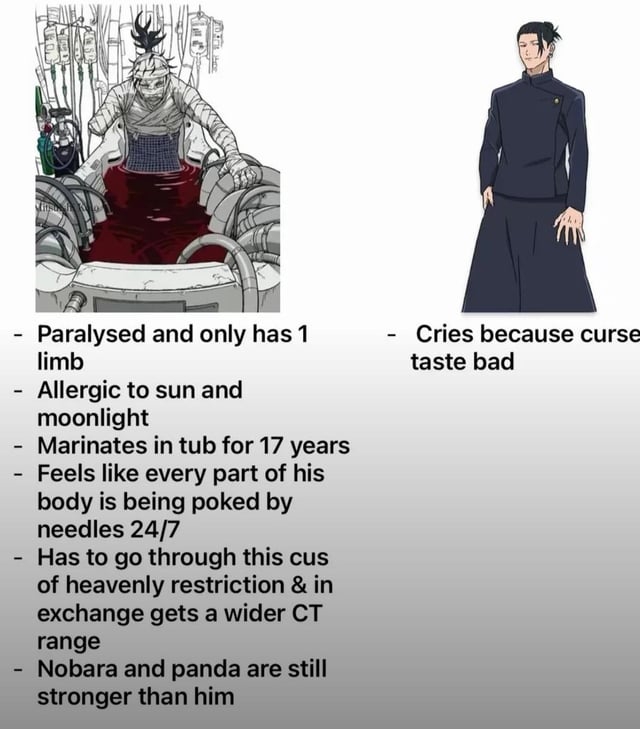 >>2455466 Именно так. Поэтому Годжо и проиграл. Если бы он выспался, расклад был бы совсем другим. Нобара дремала два месяца и поднялась от жертвы Харуты до убийцы Сукуны. Сам Сукуна хранит секрет своего могущества - хеянскую технику здорового сна по 15 часов в день, от современных магов