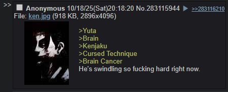 >Техники магов хранятся в мозгу >У Юки опухоль в мозгу А помните Годжо и Сукуна раз за разом разрушали свой мозг и восстанавливали обратно даже не понимая, как его правильно собрать. Ну и поколение.