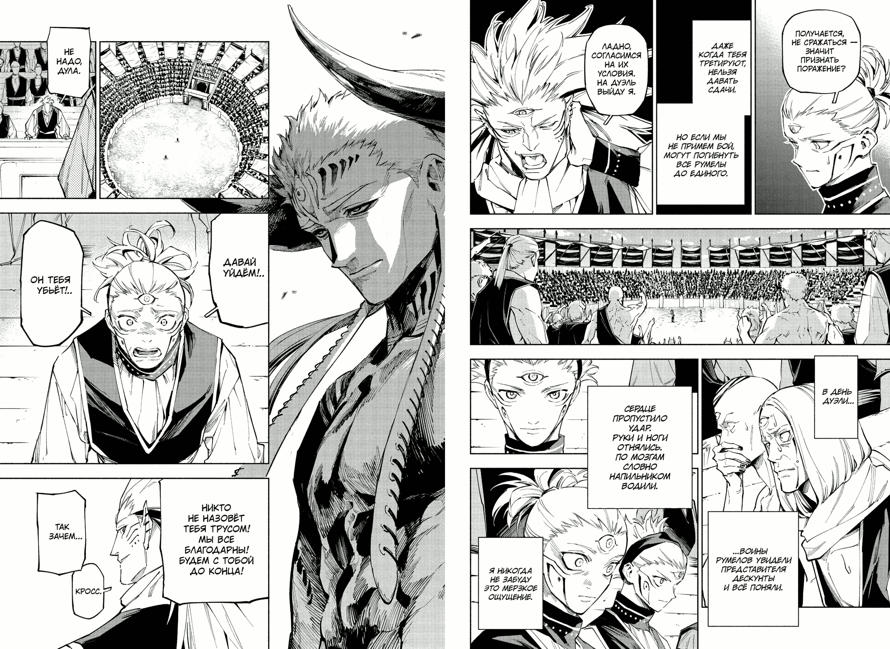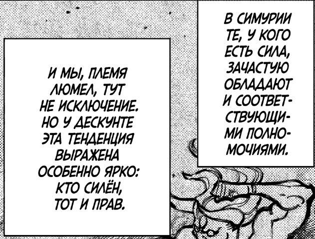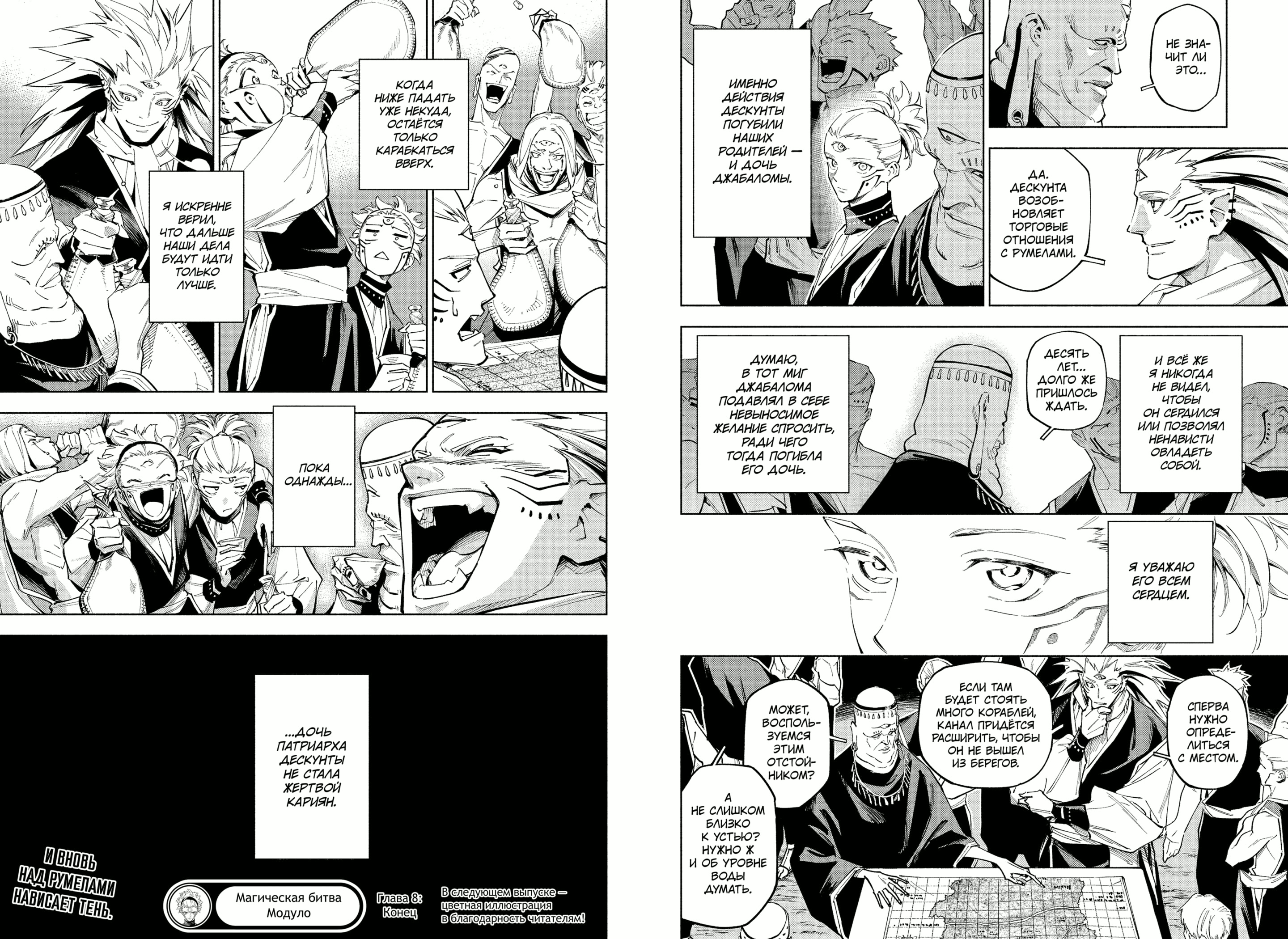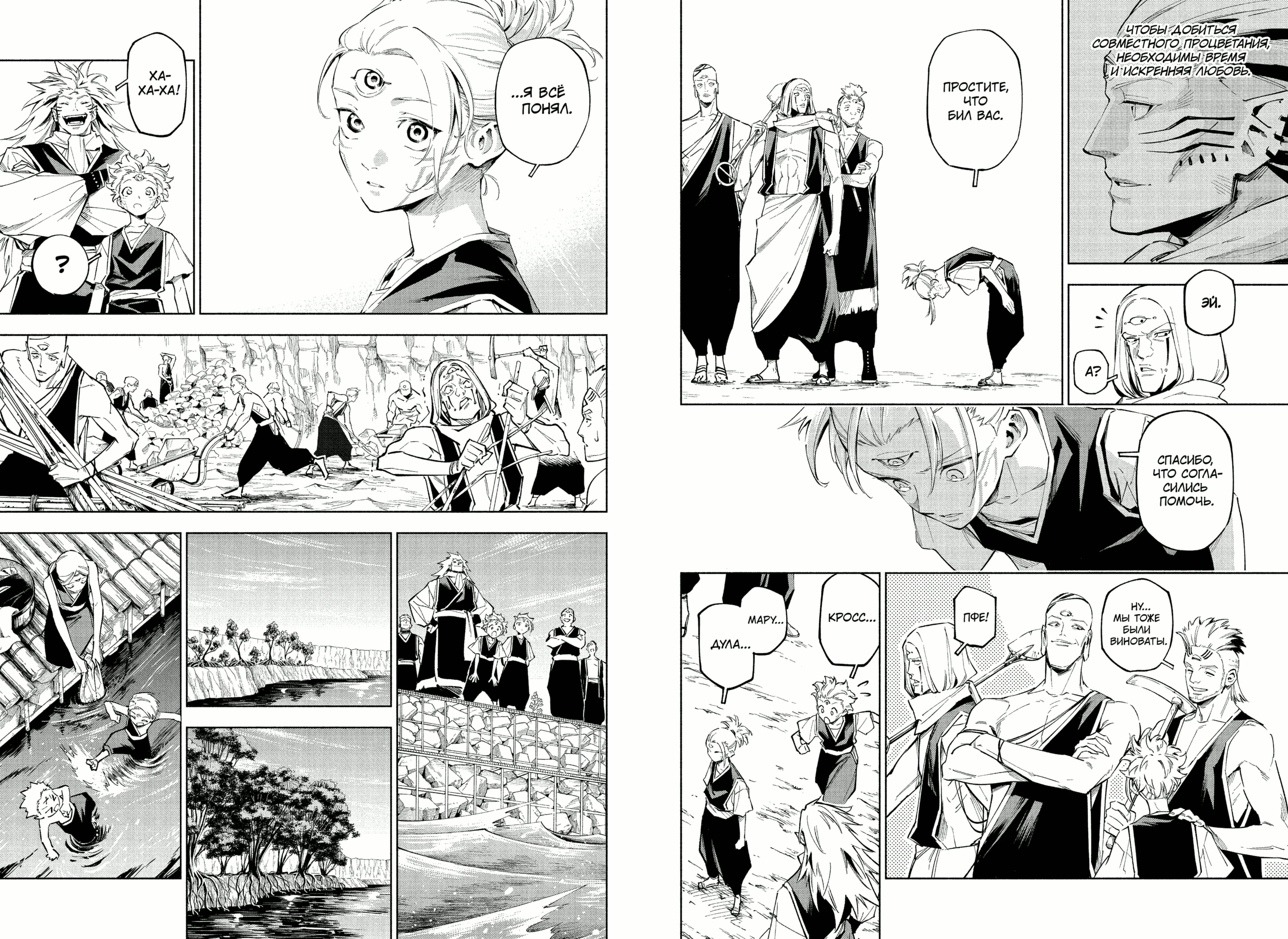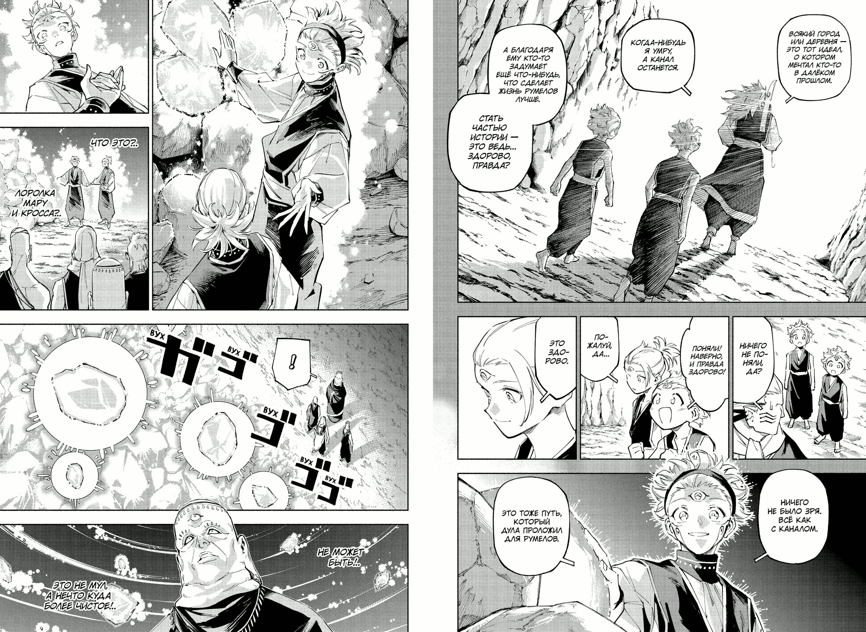 Главу перевели и там за гранью бреда. Короче. Пока срёмариане копали канал, надолбилась целая куча особого волшебного камня, который превращает Проклятую Энергию во все возможные другие виды энергии. На пикриле вы видите как Кросс и Мару взялись за руки, после чего их сила дружбомагии за секунду сотворила из этого особого камня - космический корабль. Да... просто так, без знаний и чертежей. Племенные бомжи из степей, ничего не знающие о космосе, технологиях, космических перелётах. Создали космический корабль силой дружбомагии. Геге хочет сказать, что он у нас теперь вместо Сортира... рисует сюрреалистичную Сатиру, в которой чтобы донести свою авторскую мысль, можно полностью положить болт на логику происходящего. Эдакий Андер Нинджа.