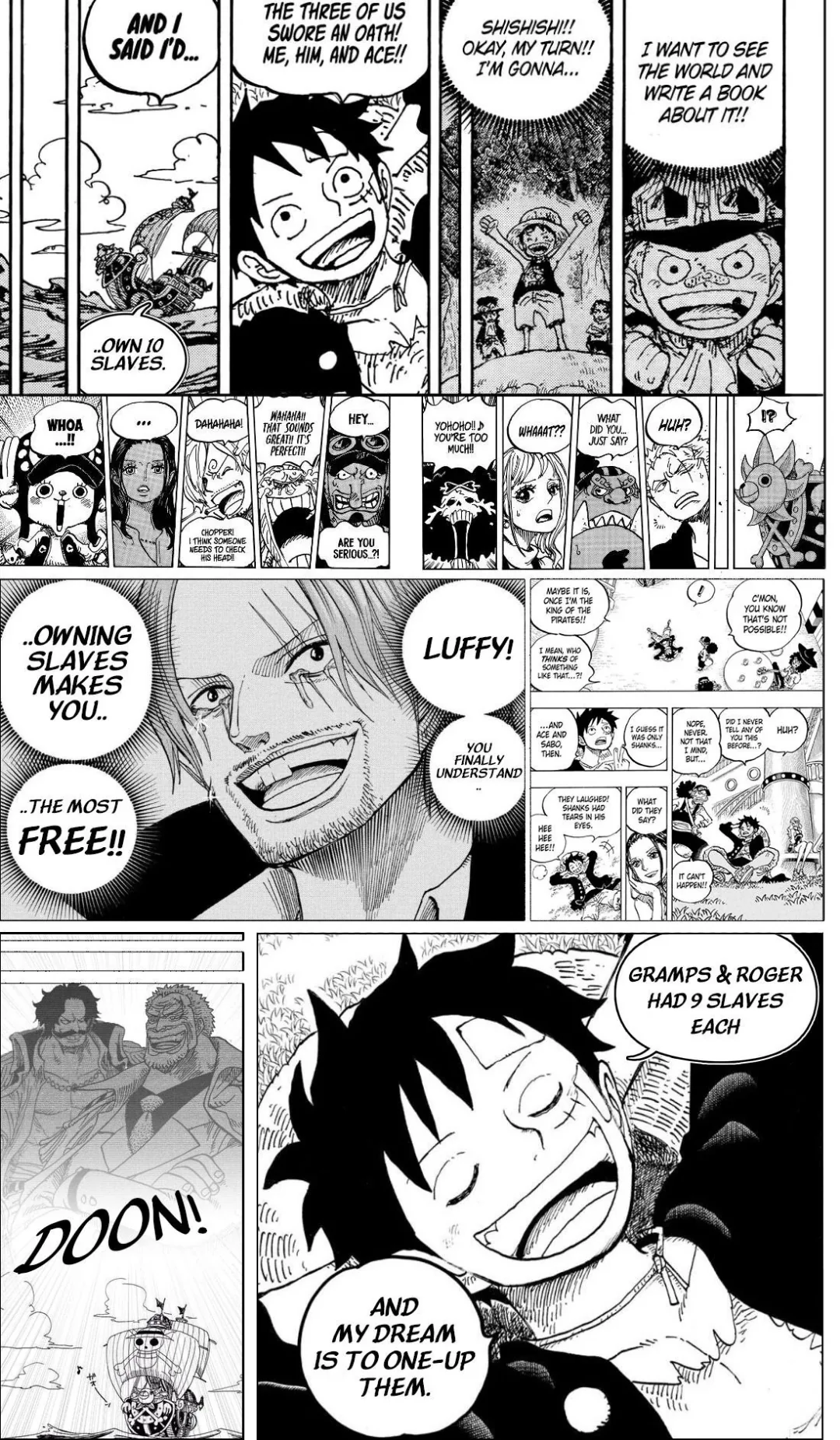 Вот для эльбаф арки тиран, который строит мир на силе и делит на господ и рабов исходя из этой же системы, был бы идеальным антагонистом. И тогда всё то, что ода впихнул во флешбек между роксом и гарольдом могло произойти между луффи и злодеем арки.