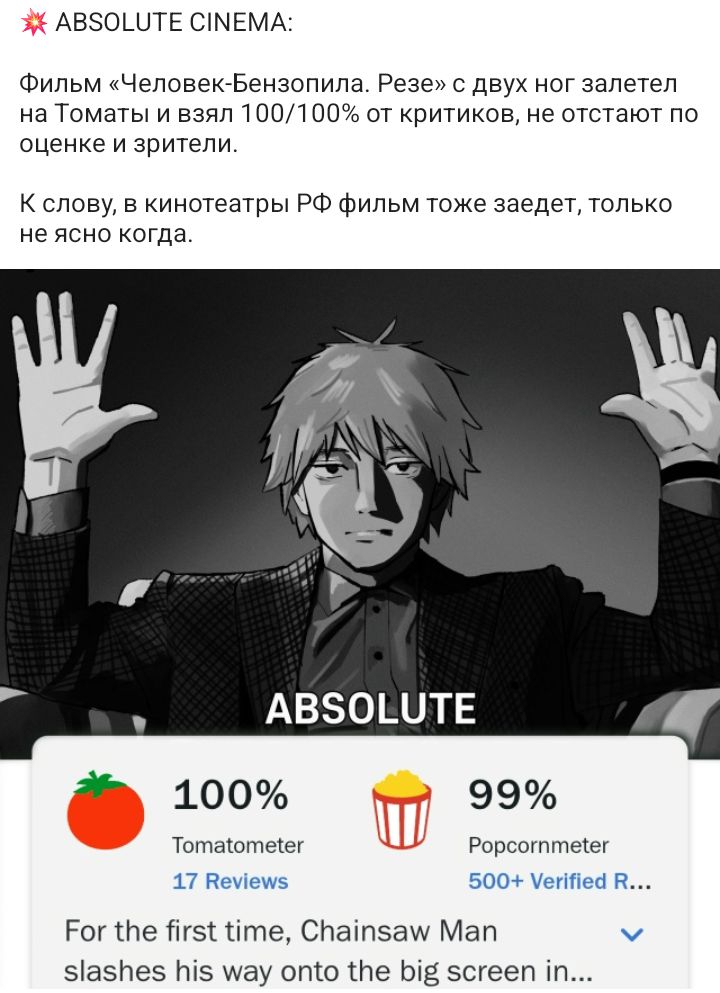 >💣 БУМ! ЗАВОДИМ БЕНЗОПИЛЫ! Дублированный трейлер «Человек-бензопила. Фильм: История Резе» уже здесь, а премьера — 4 ДЕКАБРЯ! Российский прокат станет возможен благодаря партнерству с Кинокомпанией Пионер (https://vk.com/pionerfilm)! А наш любимый дубляж от Flarrow Films (https://t.me/flarrowfilmsofficial) вернётся на большие экраны! 💥