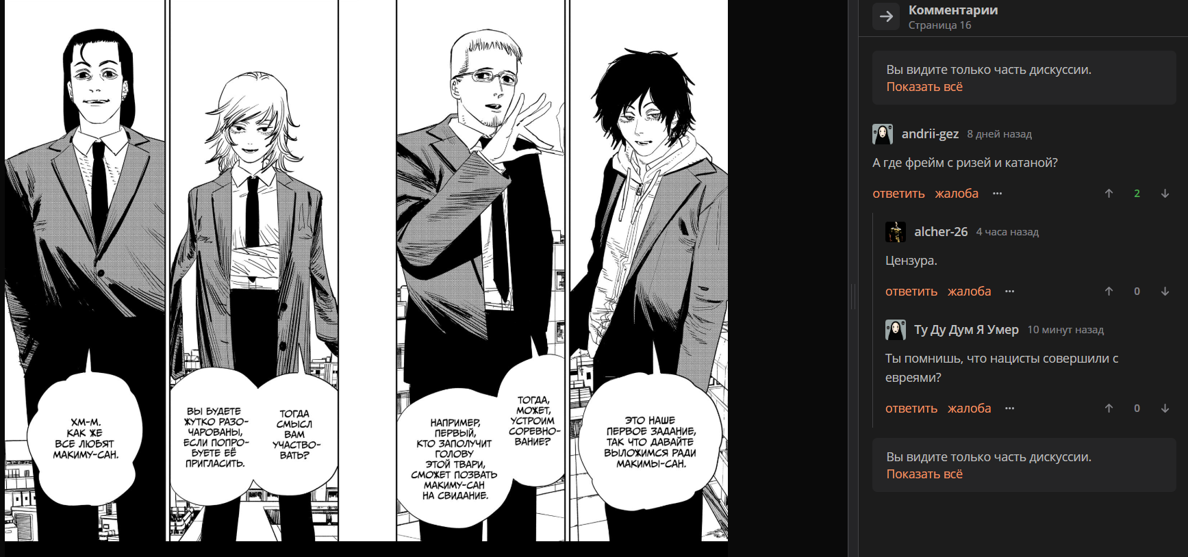 глава хуня, но да ладно мы привыкли. но если реально все так закончится это конечно супер обсер мне никогда конец первой части не нравится (слив макимы путем сожрал-высрал (я не фанбой макимы)), но это еще хуже будет
