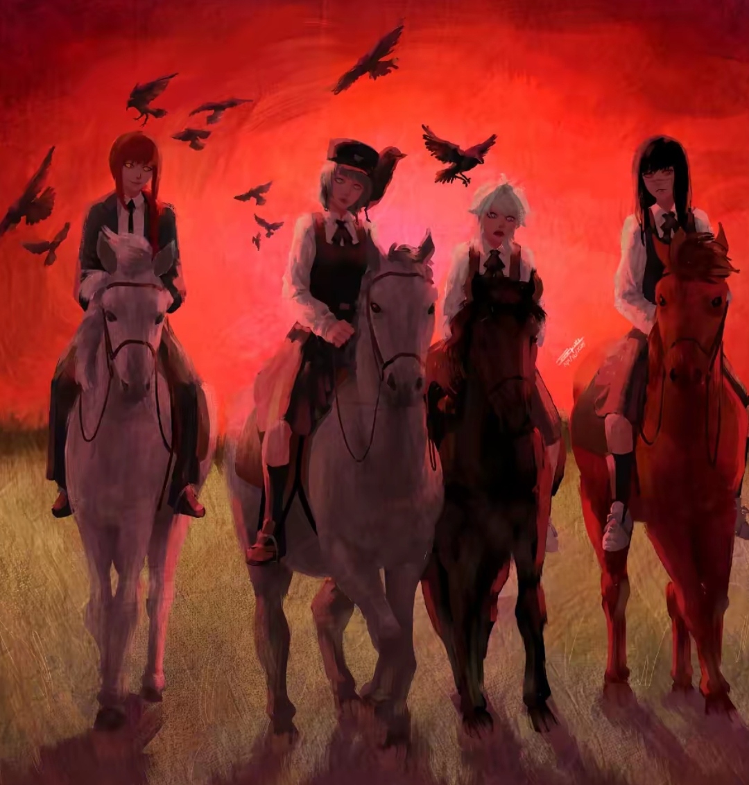 4. Увидел в треде, что кто-то упомянул последнего Всадника Апокалипсиса, мол их уже всех показали, но ведь нет? Или я тотальный жопочтец и пропустил Чуму? Война - Йор. Голод - Фами. Смерть - Лил Д. А Чума - кто? Лично у меня есть только предположение, что Чума это Фумико, с её контрактом с демоном ЗППП как прикрытием, но это вилами на воде.