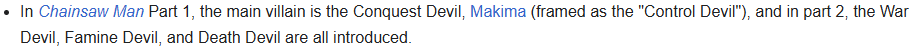 Вспомнил, что я жопочтец и дату происходящих нам событий, показывают прям в реальном времени, в манге. Насчет Макимы даже на педии написали, для тех, кто не понял (меня). Я то думал она очередняра АКА демон Контроля, просто достаточно сильный, как Падение, Тьма и Старение, а она оказывается Всадник была. Тогда Фумико никакая не Чума, а Санта-Клаус 2.0. Насчет Узбека так и не понял. Алсо, еще касательно Ган дэвила из первой части вопросик: Он получается сыночек Йору? Она вроде его там присуммонила в каком-то моменте, как и дэвила Танка. Получается Аки всю жизнь хуйней занимался, собирая кусочки Пушкодемона и надо было сразу Йорку просить вызвонить сына.