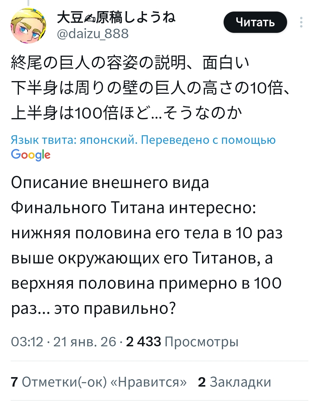 И вторая вдогонку. В конце мы увидели намёк на повторение истории. Но это ведь не обязательно должна быть именно сила титанов. Просто в такой вид воплотилось понимание силы самой Имир. Быть больше, стукать больнее, заращивать раны. А большая часть последующего пиздеца происходила только из-за её шизы. Так что, я думаю, что пездюк скорее станет каким-нибудь Суперменом, а не титаном.