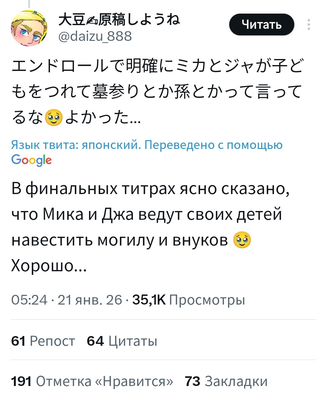 >>2486189 Но концовку я правильно уловил? Эрен стал каким-то амогусом, устроил рамблинг оказывается это не только песня моих SiMов, а потом такой - ладно, нацики должны жить, Микаса, отчекрыжь мне бошку. Просто я к чему. Думал посмотреть аниме, оно вроде все вышло, но я люблю хорошие концовки, где зло получает пизды, без соевых - миру мир.