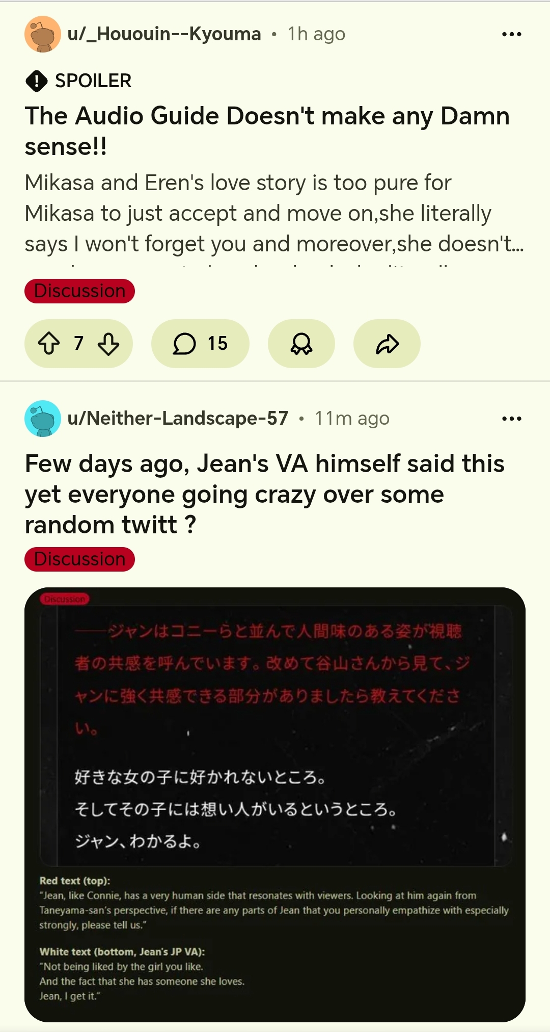 Только сегодня выкупил в чём прикол сцены, где Эрен говорит: "Руки на стол, блять!" Он скорее всего видел, что опиздюлит Армина и хотел этого избежать.
