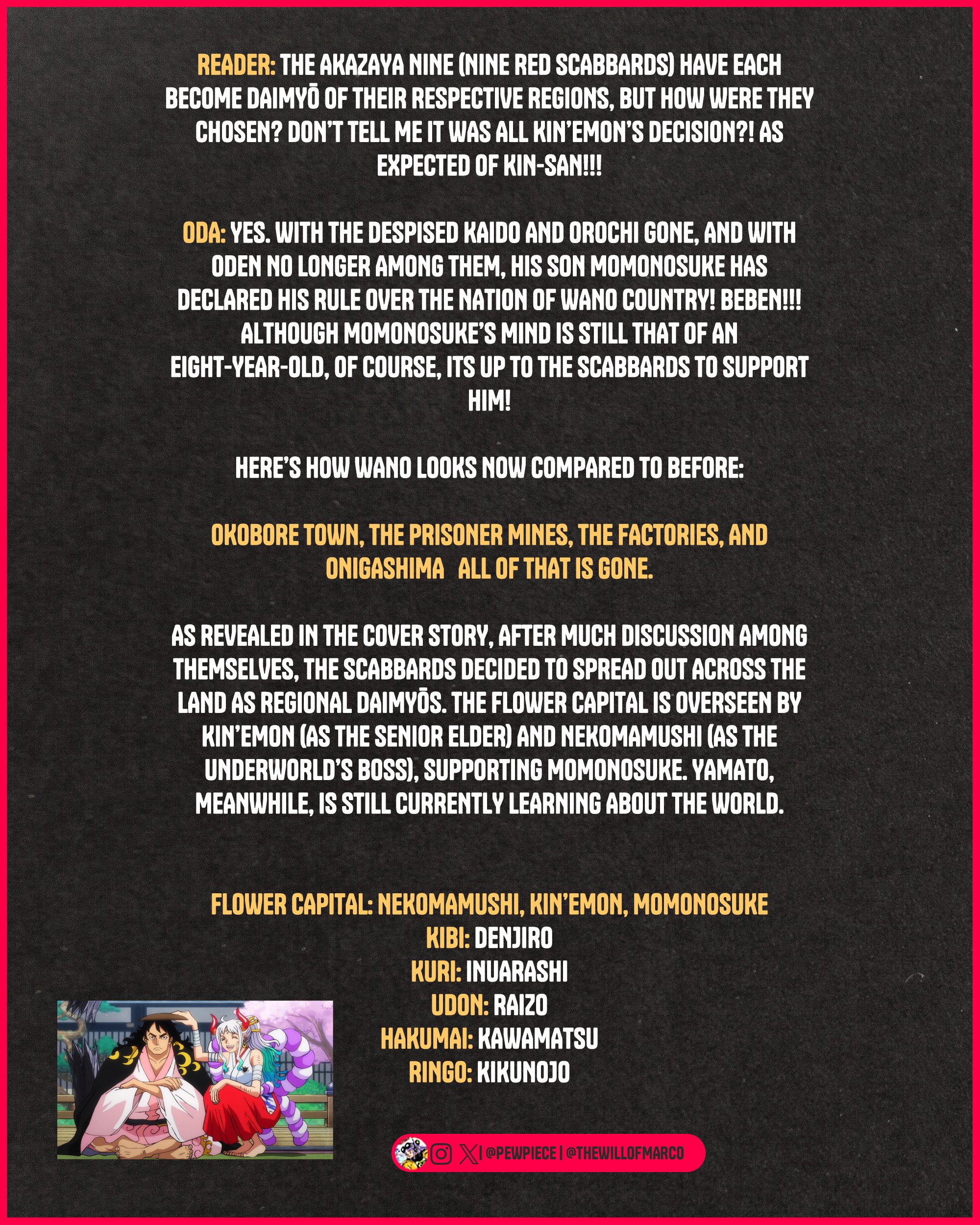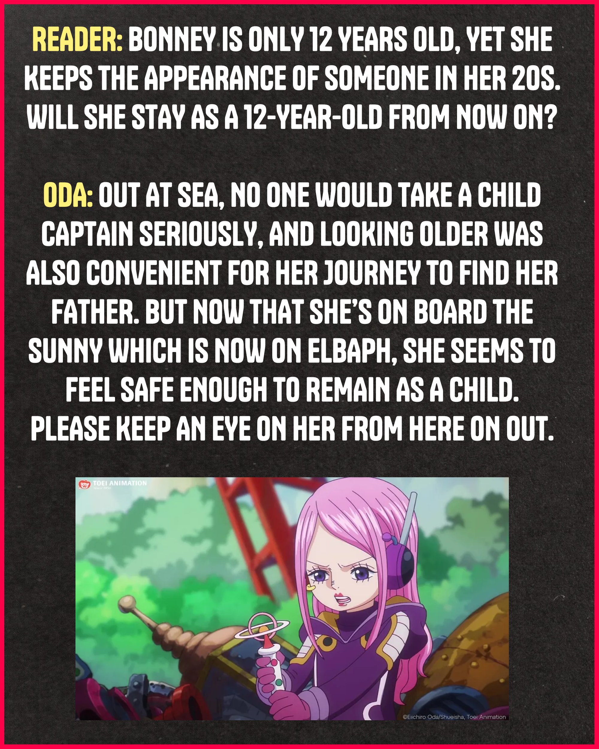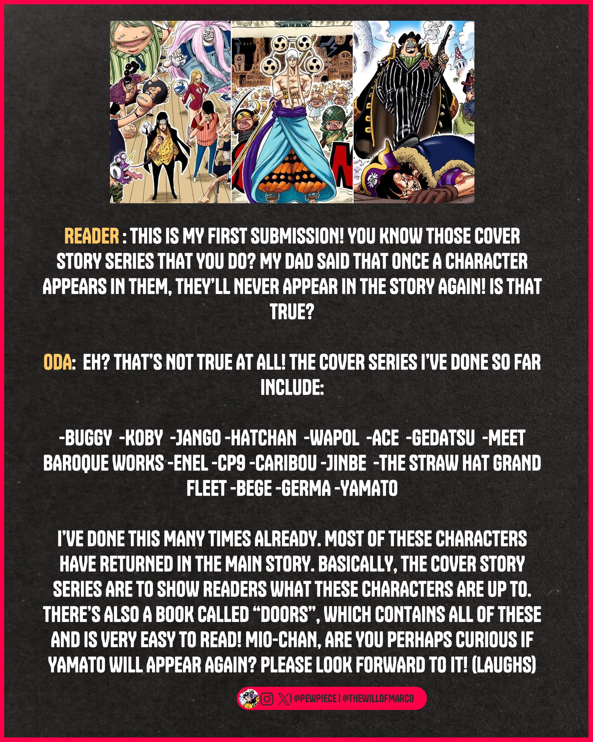 И как Луффи преследовал свои цели, защищая каких-то очередняр, поэтому и сражался с Кайдо. Так и Кайдо и БМ могли преследовать какие-то свои интересы. И та же армия зоанщиков была бы к примеру строиться потому что Кайдо готовил армию против Иму.