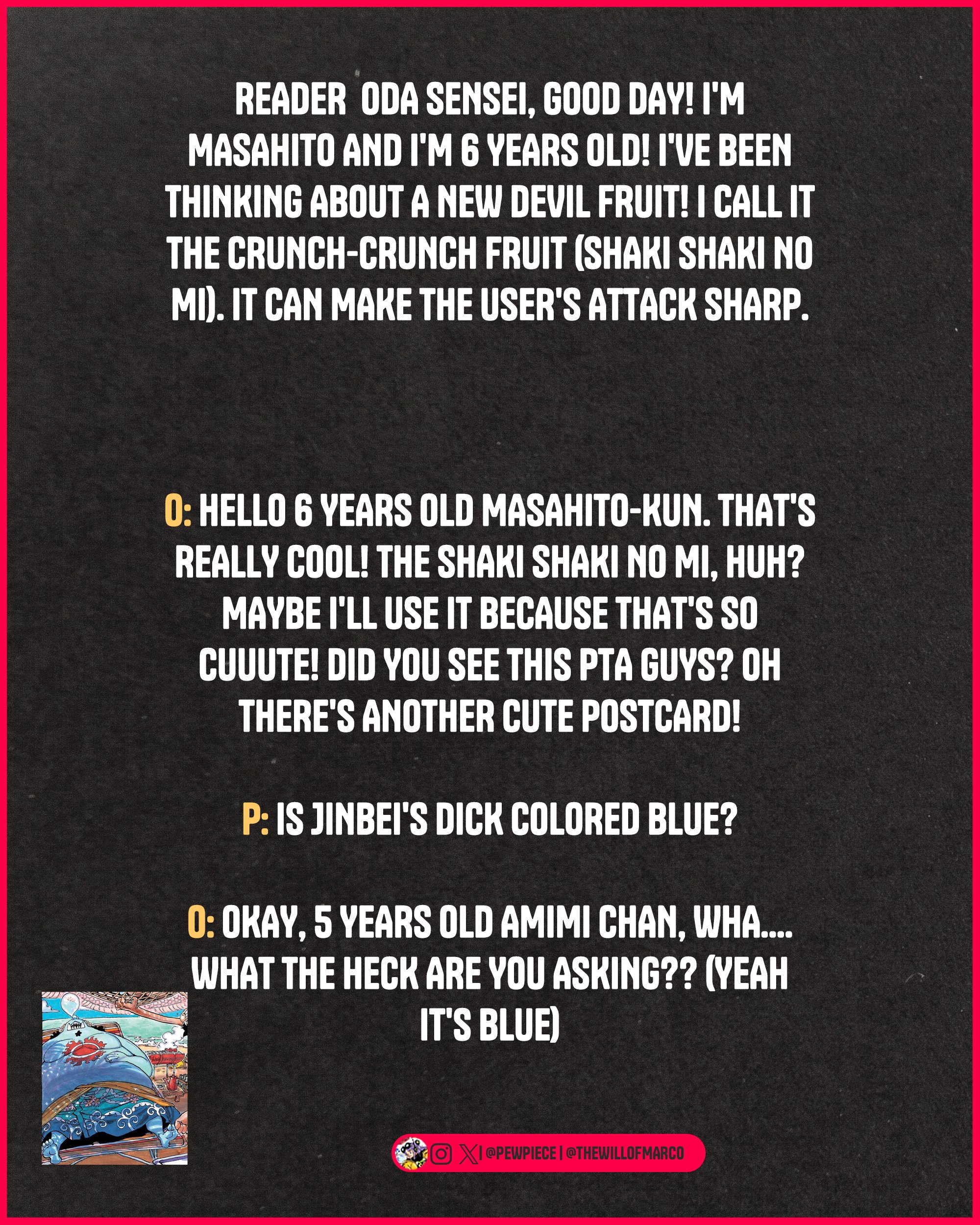 Да ещё доправьте так, чтобы по факту всё равно был обмен ударами, потому что слишком большой отсебятина типа новых приёмов и кретиных использований фрукта, не понравится джампу, ведь Ода так не задумывал ОДА ВООБЩЕ НИКАК НЕ ЗАДУМАЛ