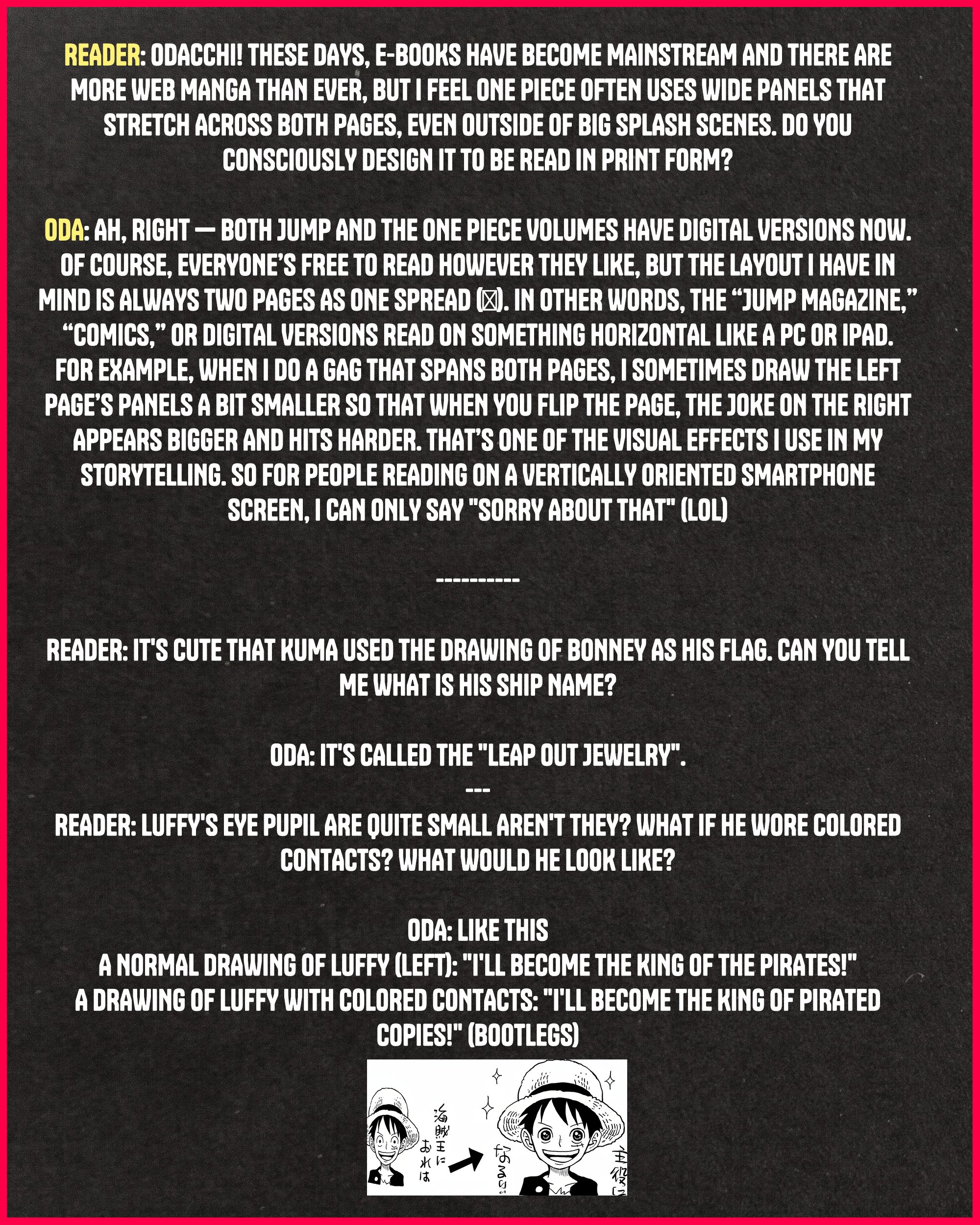 Ебать Ода мразь конечно. если он сука реально всё скатит в полнейшую избранность и даже не такую что Луффи похож характером на Роджера и получил его шляпу а вообще какие-то боги, воли, тысячелетние пророчества то пусть идет нахуй долбоеб пиздоглазый. Он буквально по пизде путит всю мангу и её посыл. Камина больше передает дух чем Луффи и вся манга после тс.