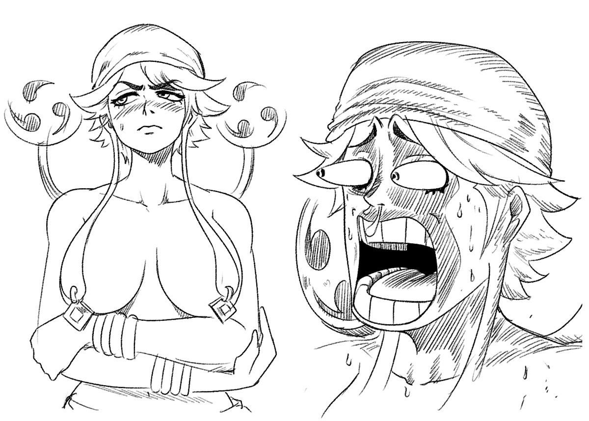 Она кстати та еще шлюха, надевала фартук на голое тело и так ходила, завлекала в свое кафе. Буквально ранняя Нами будь у той губки побольше Не удивлюсь что никто Шакки не похищал, просто предложили поработать ртом за миллион белли и она сама побежала к тенрюбито, а те её и кинули и просто в тюрячку запихнули.