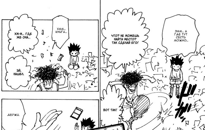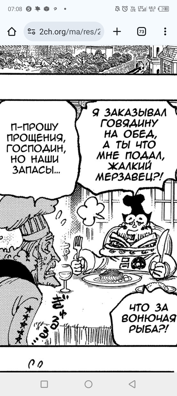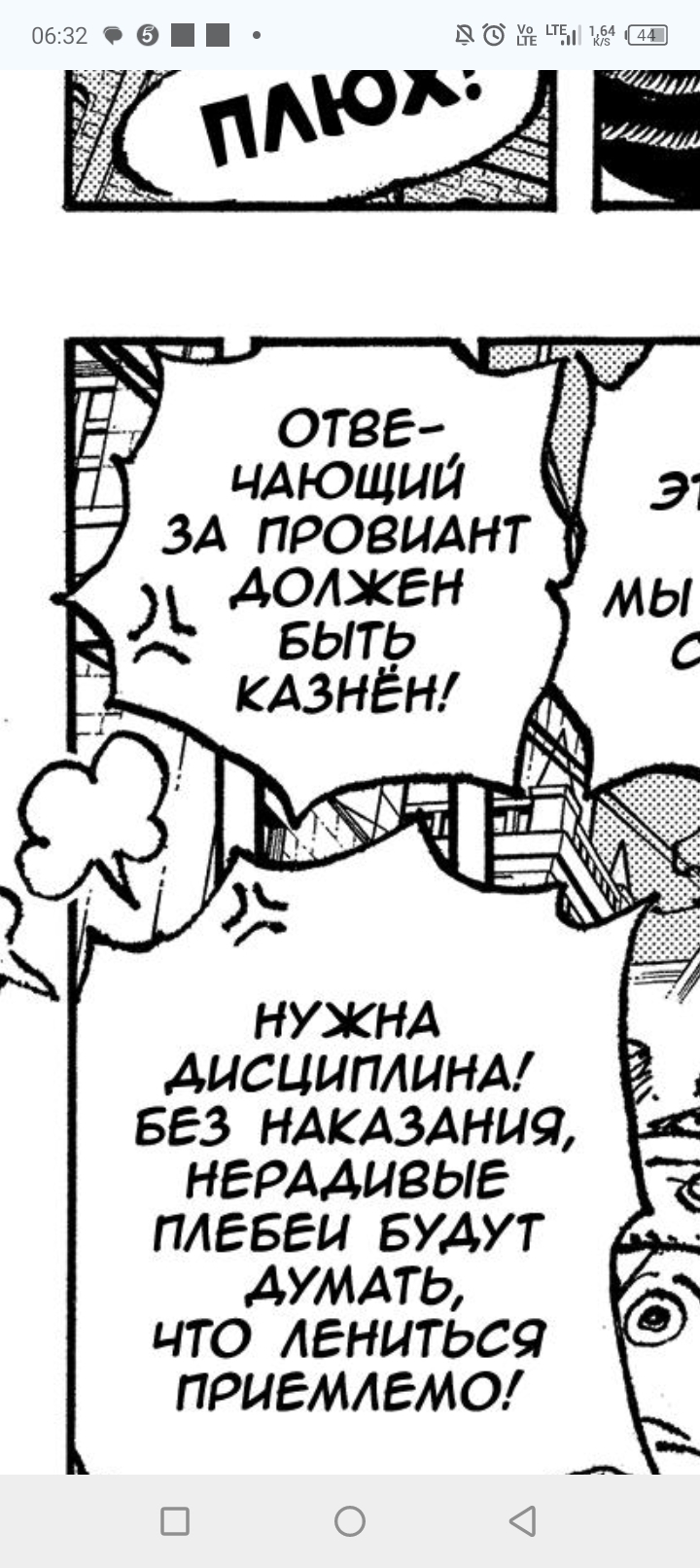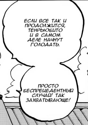 Если нарисовано и рассказано, что поставки с едой взрываются и не доезжают это игнорируется. Если нарисовано и рассказано, что тенрьюбито лишаются привычного количества приема пищи в день и не могут получить некоторые блюда это игнорируется. Но если нарисован один кусок рыбы, то это значит ничего не происходит и все ХО РО ШО. Ну желаю хантерододику всю жизнь вот так не голодать. Ведь если он будет игнорировать причину отсутствия новой еды, то и следствия этому не произойдет. А значит уже не голодный.