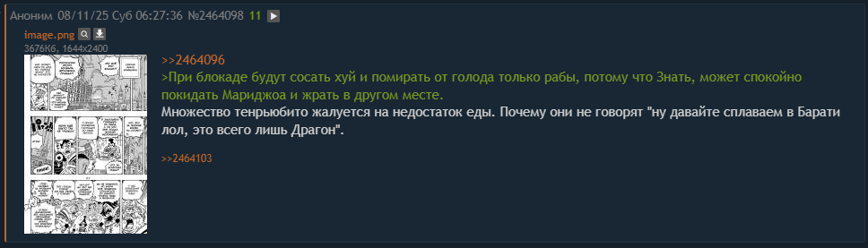 >При блокаде будут сосать хуй и помирать от голода только рабы, потому что Знать, может спокойно покидать Мариджоа и жрать в другом месте. Я скинул скрины где тебе сам автор пишет, что там голод среди тенрюбито начнется, ты продолжаешь срать под себя