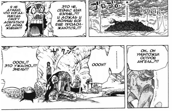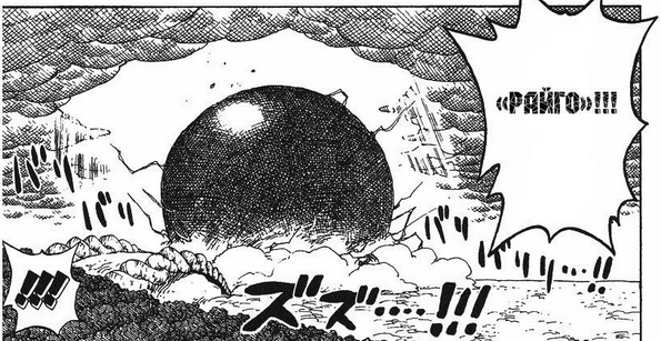 Но вот именно уничтожения острова было всего 2: энелем и еба-машиной Иму на мамашином пламени. Причем очевидно что йоба-машина сильнее чем энель в разрушительном потенциале, но вот Энель + его кораблик Максимка выдают соизмеримую мощь. Это забавно, что Энель умудрился собрать по сути собственное Древнее Оружие.