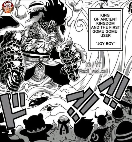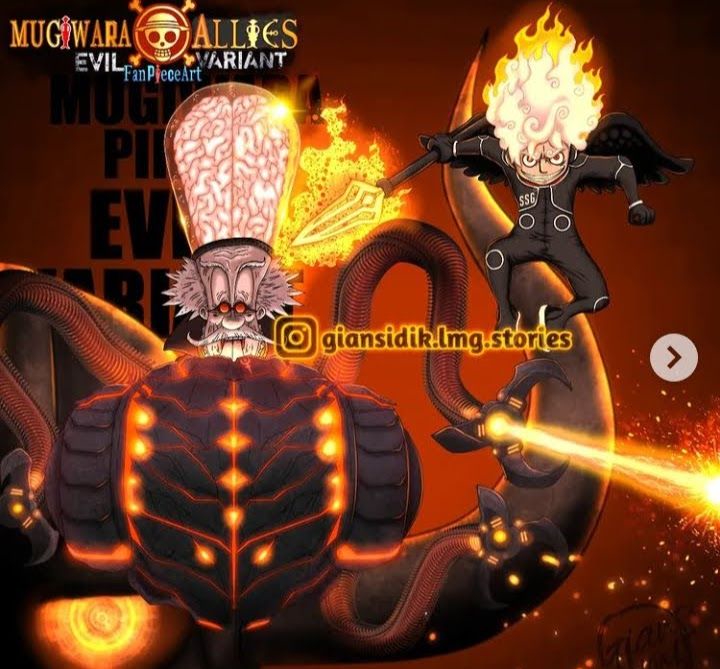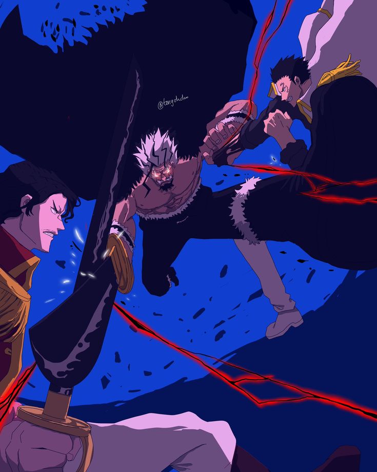 Одно крыло. Луффи + Драгон + Гарп + их прадед Конг атакуют комбо атакой как Роджер и Гарп когда-то против Шебека