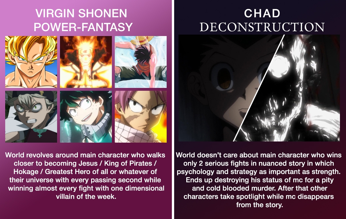 Лол, Хантер со временем только развил боевую систему. А Ван пис наоборот деграднул, остались только Клэши Хаки и Ника, который будет бегать по небу, корчить рожи и падать без сил по 50 раз. Меня уже заебала эта хуета с клэшеми или когда Луффи выдохся, пусть тогда нахуй с собой носит рюкзак с едой. В Хантере дохуя типов Нен и стилей боя. Есть ударники, можно крутить кулак и делать его сильнее. Есть челы которые давят пушечным мясом и используют мирняк. Тактические бойцы как чел с дымом. Из нен можно любую хуйню делать и это будет круто и свежо. Щас добавили стенды и проклятия, до этого были условия и клятвы. Короче эпично. Не то что дробление резины 100 глав и враг падает на спину.