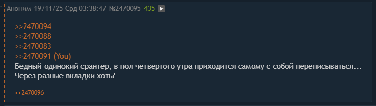 >>2470094 >>2470088 >>2470083 >>2470091 Бедный одинокий срантер, в пол четвертого утра приходится самому с собой переписываться... Через разные вкладки хоть?