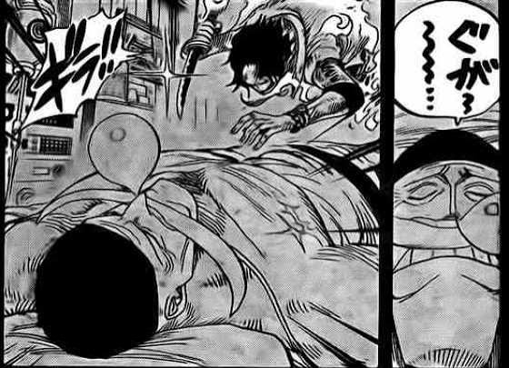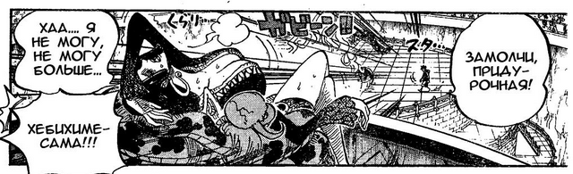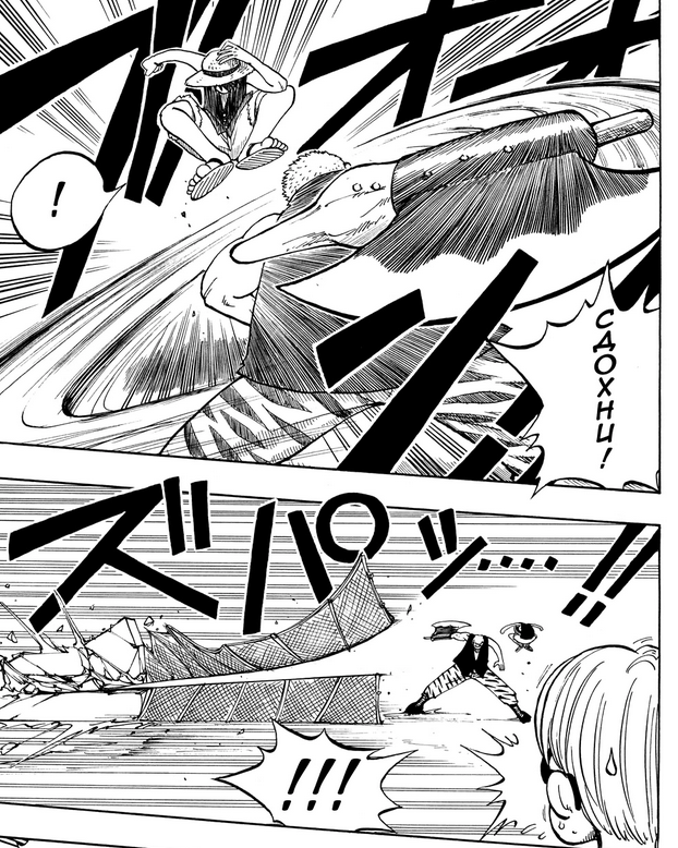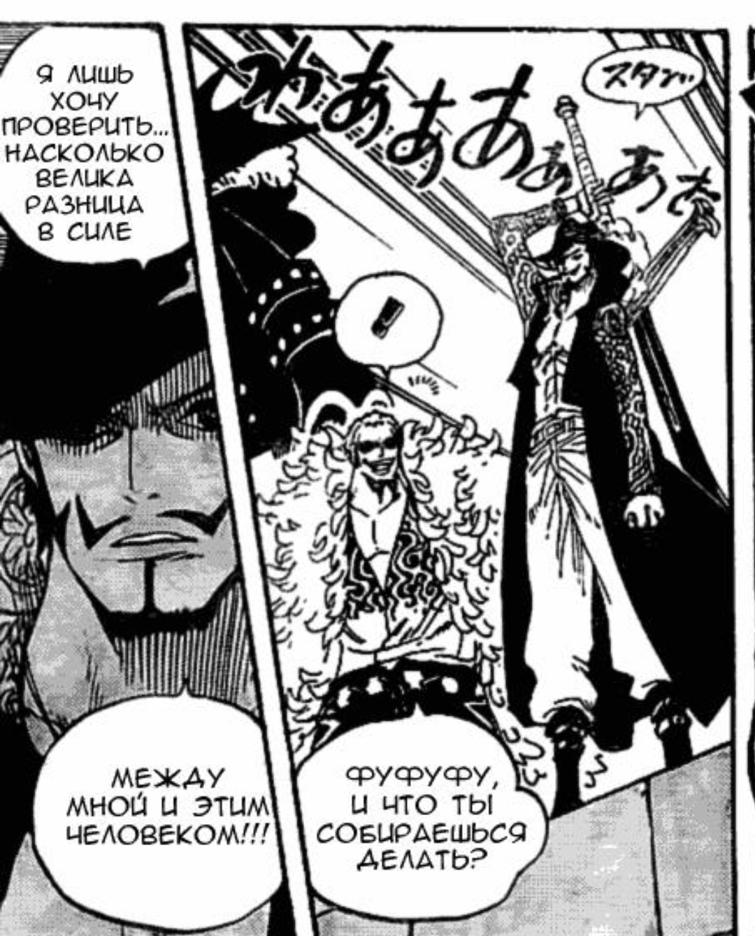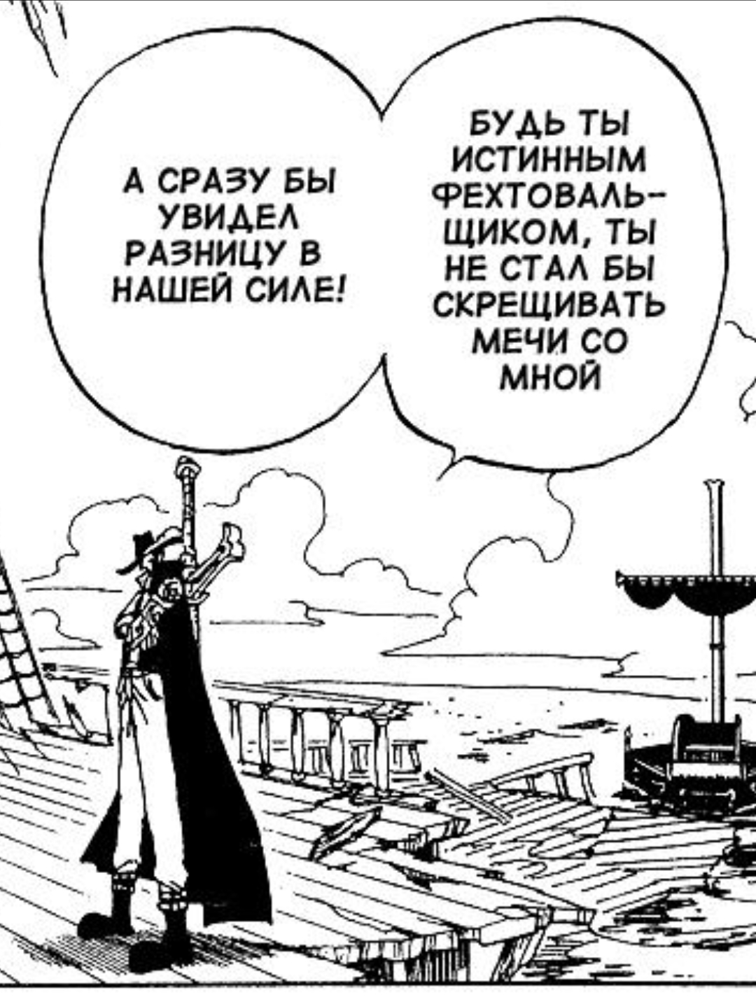 Лооол. Хейтеры михоука, я вам покушать принес. Михоук охуел от атаки зоро времен ист блю! Причем охуел так сильно, что на панике тупо выставил меч перед собой. Ему просто повезло что клинки зоро сломались, так-то он мог отлелеть уже тогда.